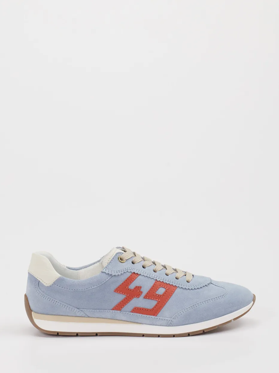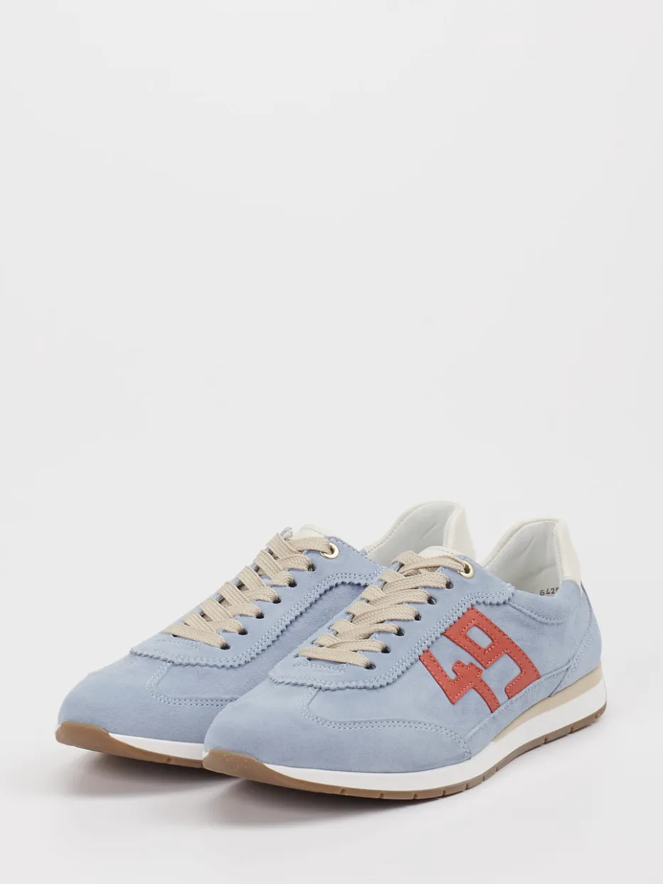 Retro-Charme trifft auf modernen Komfort: Der hellblaue Veloursleder-Sneaker von Ara überzeugt mit kontrastreicher Ziffern-Applikation und gepolstertem Einstieg.