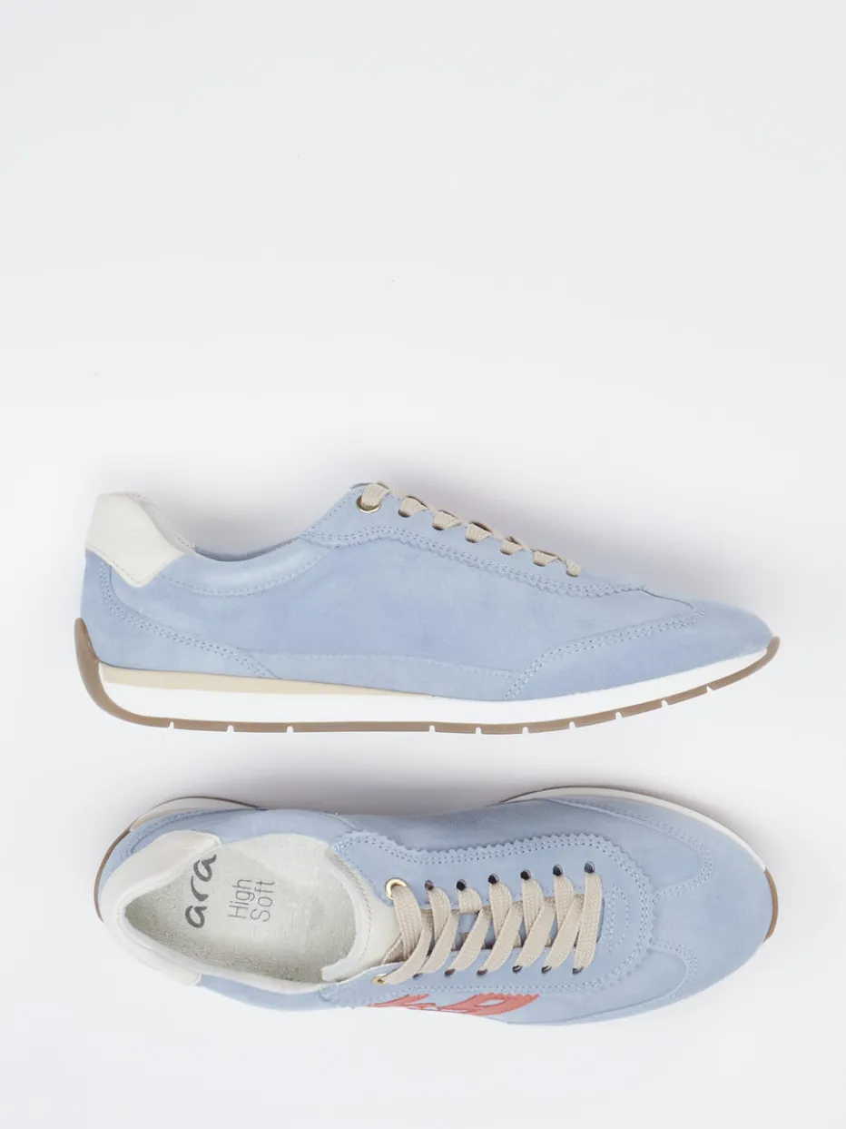 Stilvoll durch den Tag. Ara bietet mit diesem Damen-Sneaker eine bequeme und zugleich trendbewusste Option für Alltag und Freizeit. Ideal für entspannte Unternehmungen überzeugt das Modell durch sein mattes Veloursleder in Hellblau, das mit einer ziegelroten Seitenapplikation und einer cremeweißen Fersenkappe akzentuiert wird. Die flache, schmale Silhouette in Kombination mit gepolstertem Schaftrand und Gummisohle garantiert Tragekomfort. Die Schnürung sorgt für individuelle Anpassung, während der Vintage-Look perfekt zum Retro Runner Revival passt. Lässiger Stil für modeaffine Trägerinnen – besonders kombinierbar mit Canvas und Windbreakern. Komfort und Designkompetenz – typisch Ara.