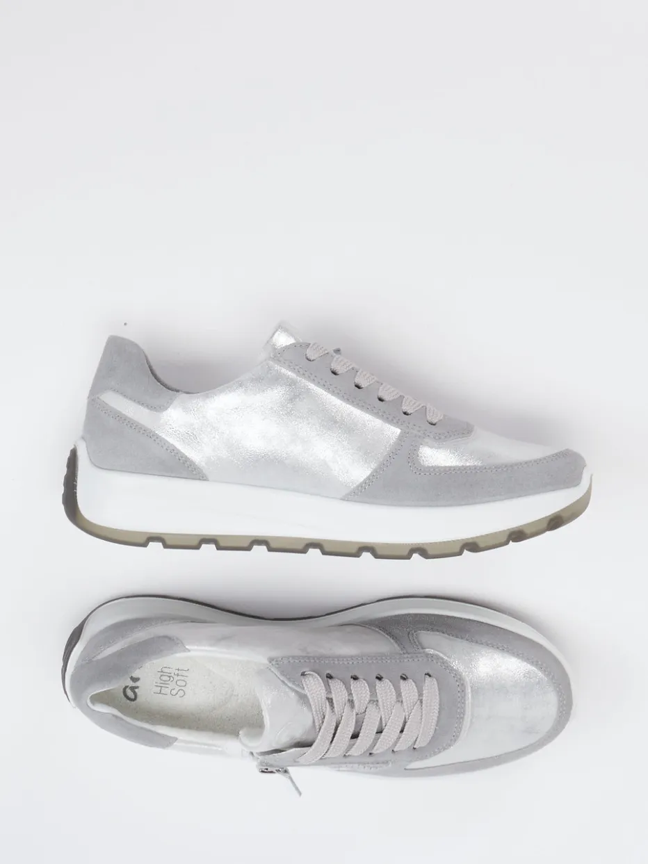 Sportlicher Chic mit dezentem Glanz. Ara präsentiert einen bequemen Damen-Sneaker für Alltag und Freizeit. Ideal für Tage unterwegs: Das Modell kombiniert anschmiegsames Veloursleder mit glatten Partien und einem fein schimmernden Finish. Die hellgraue Farbgebung mit weißen Akzenten wirkt modern und vielseitig. Details wie der seitliche Reißverschluss in Silberoptik und die profilierte Gummisohle sorgen für Funktionalität und Komfort auf Schritt und Tritt – gepolsterte Elemente erhöhen den Tragekomfort. Die klassische Silhouette greift minimalistische Streetwear-Einflüsse auf und passt ebenso zu lässigen Jeans wie zu einer Steppjacke in Pastelltönen. Ein stilvoll-lässiger Begleiter mit bequemer Passform von Ara.