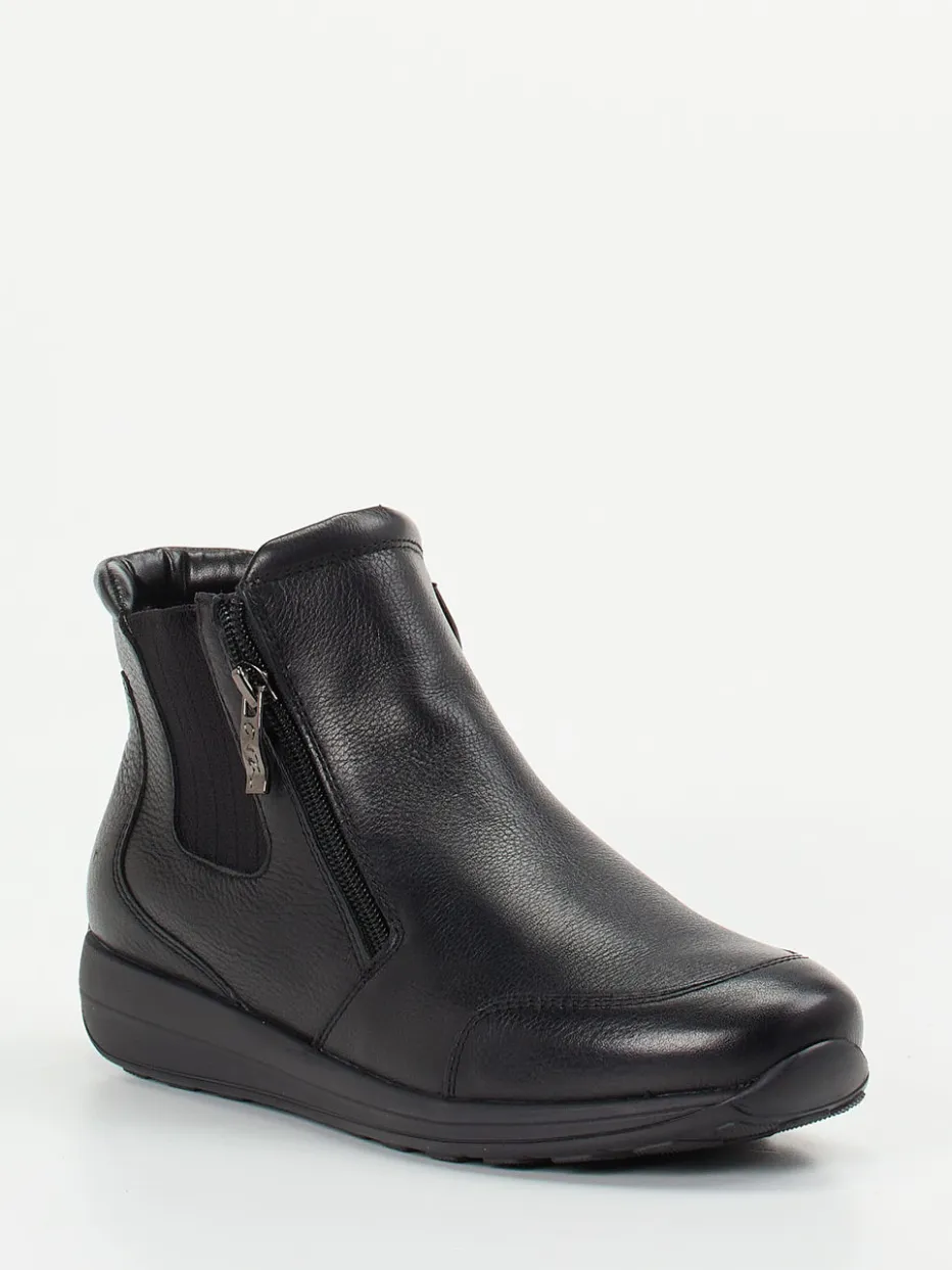 Diese knöchelhohe Komfort-Stiefelette kombiniert genarbtes Kalbleder mit funktionalem Design. Doppelte Reißverschlüsse und ein elastischer Einsatz erleichtern das Anziehen im Alltag.