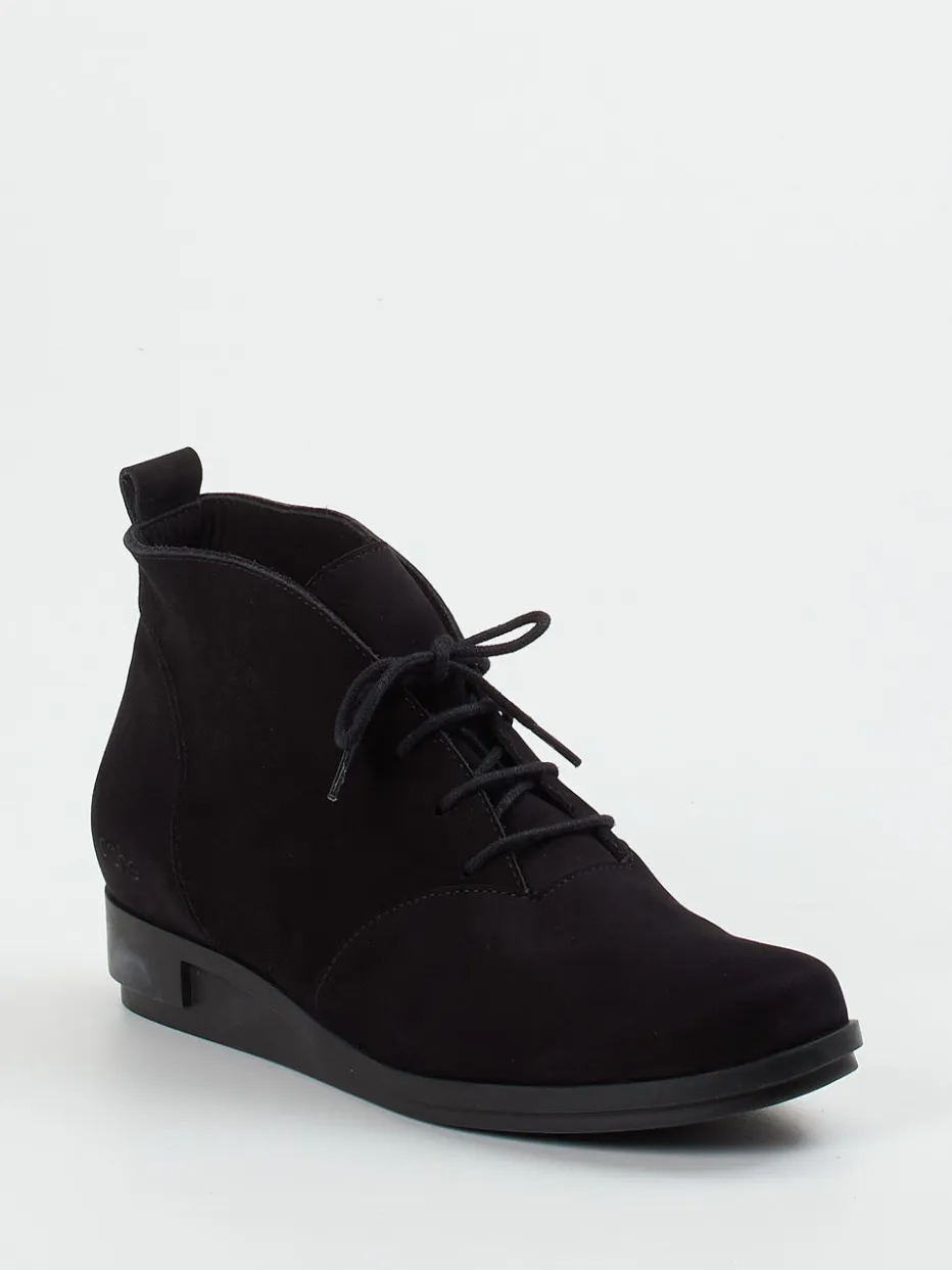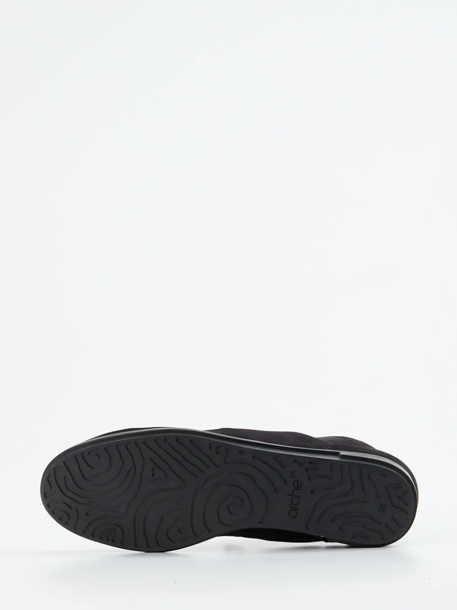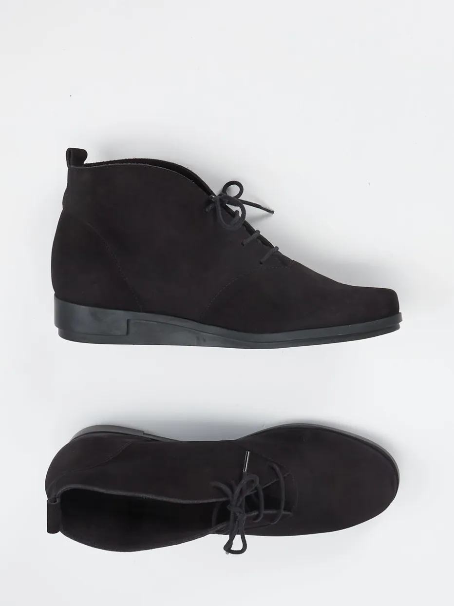 Wohldosierte Zurückhaltung trifft Funktion.Die Marke Arche interpretiert den Damen-Schnürschuh mit diesem keilförmigen Bootie neu. Für stilbewusste Tage im Büro oder entspannte Stunden in der Freizeit bietet das Modell mit tiefschwarzem, samtig angeschliffenem Nubukleder einen besonders hohen Komfort. Das knöchelhohe Design kombiniert dezente Ton-in-Ton-Nähte, eine hintere Zuglasche sowie eine flexible Laufsohle aus Naturlatex. Die weiche Polsterung im Innenschuh trifft auf klare Linienführung und ein leises Understatement im Sinne des Trends „Quiet Luxury“. Ideal zu monochromen Strickkleidern oder reduziertem Hosenlook. Ein hochwertiger Alltagsbegleiter für Anspruch und Leichtigkeit.