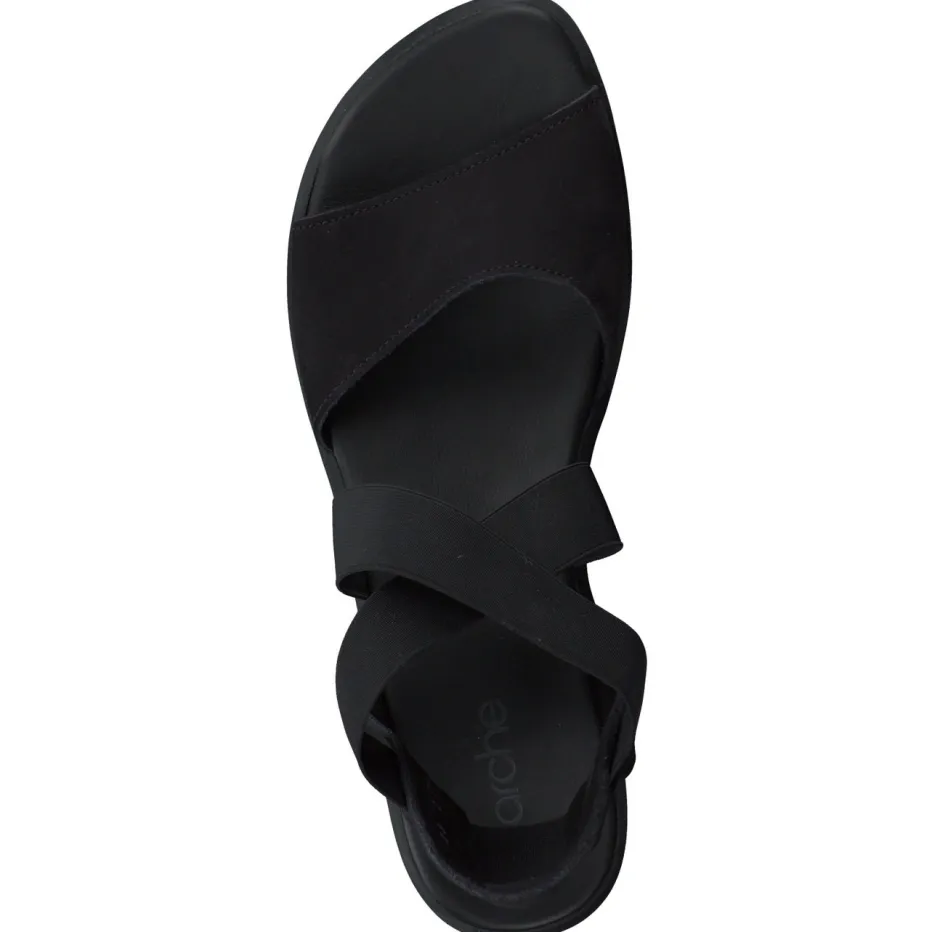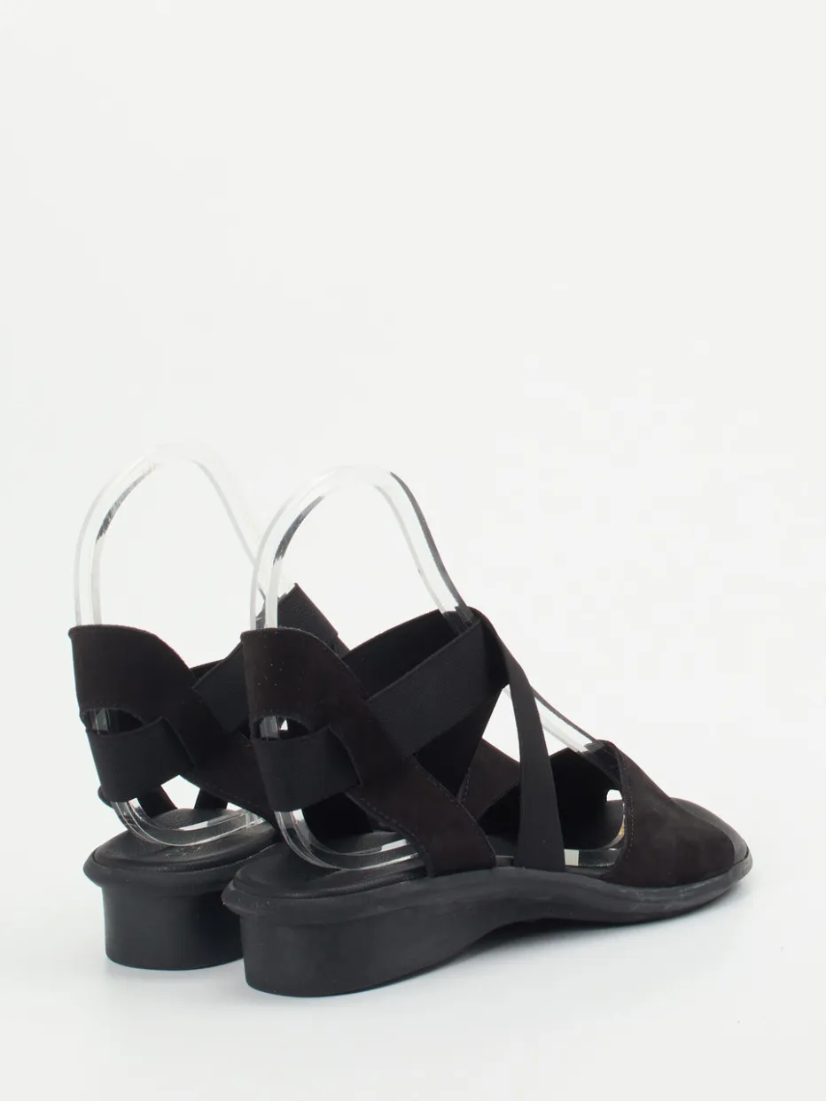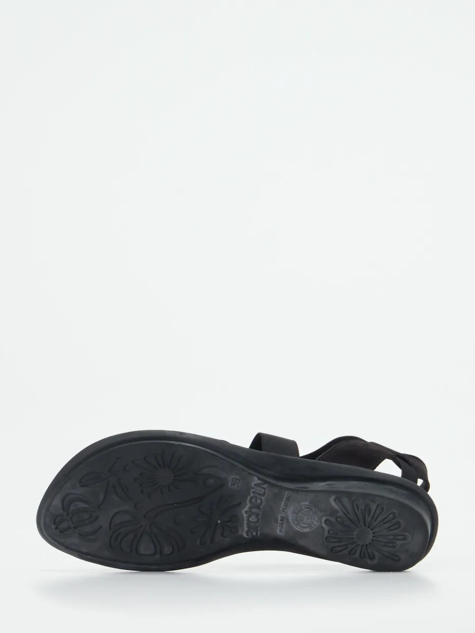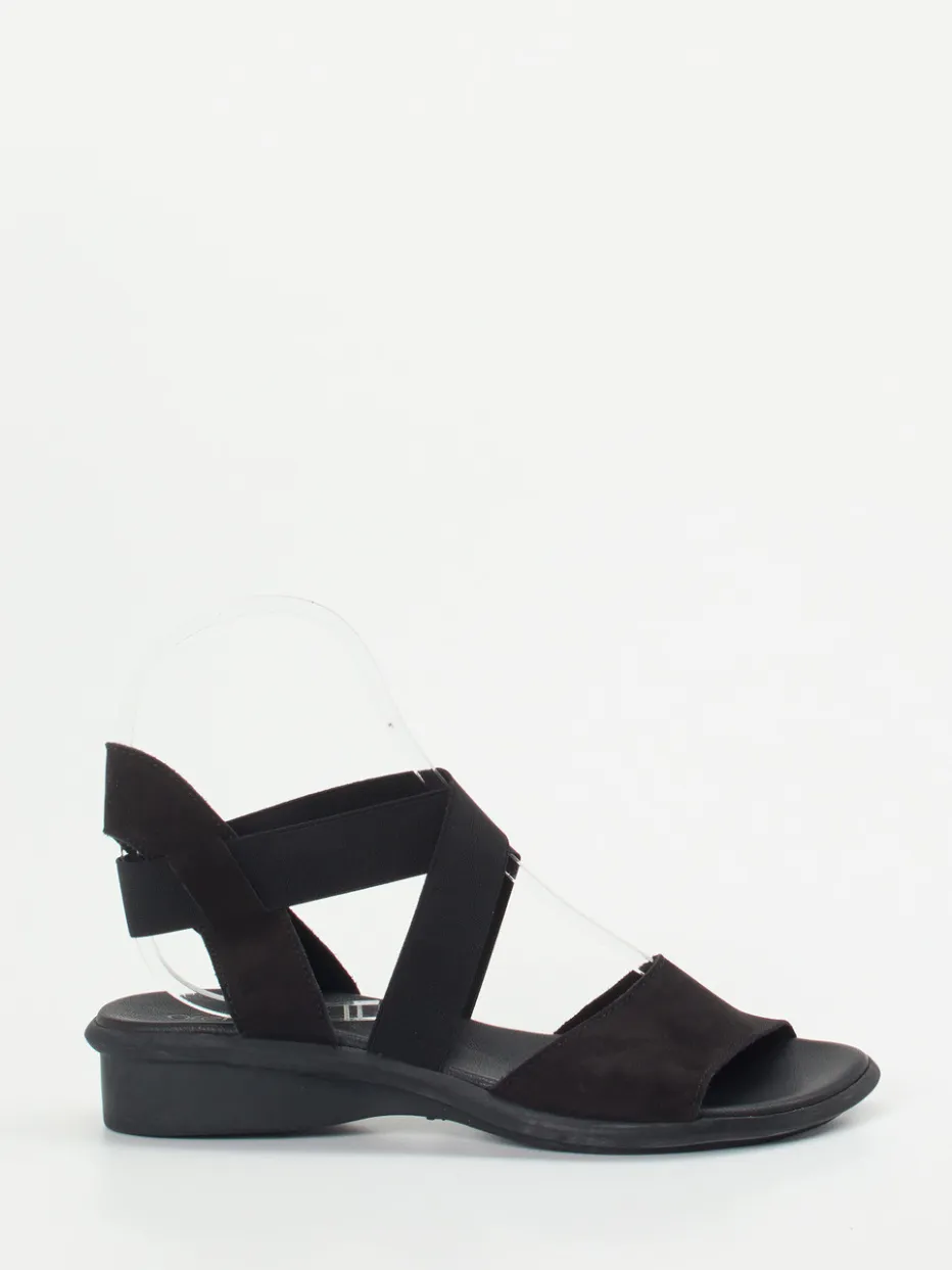 Bequem ist diese sportive Sandale auf einer wunderbar weichen Latexsohle. Der Leisten zeigt sich asymmetrisch und bewährt. Das schwarze Nubukleder ist ein Evergreen bei der Marke Arche. Dem Fuß bietet die breite Vorderbandage einen perfekten Halt. Die über Kreuz geführten, schwarzen elastischen Riemchen schmeicheln dem Bein und passen sich unkompliziert bei jedem Schritt an den Fuß an.
