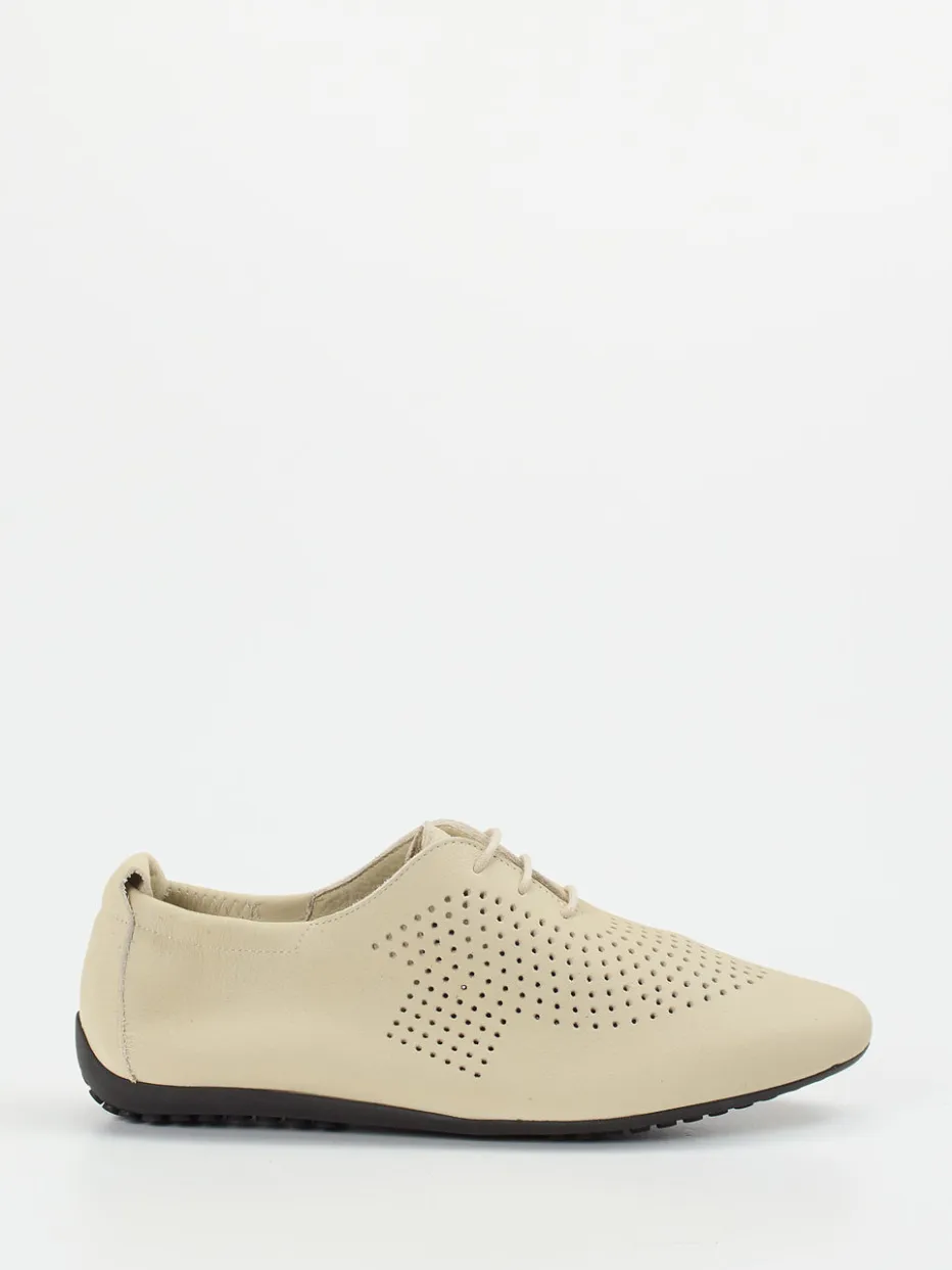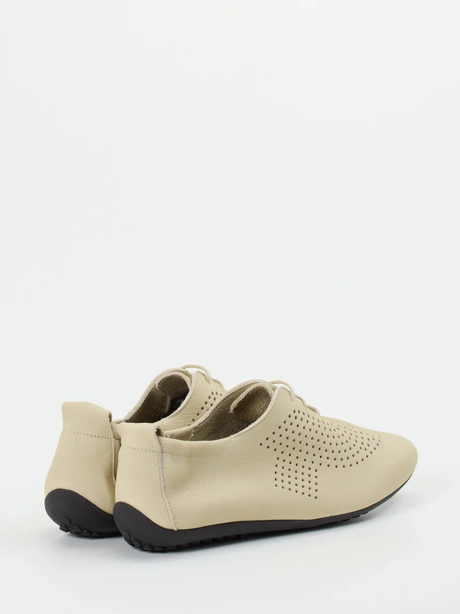 Ideal für warme Tage im Büro oder entspannte Stadtbummel: Das hell beigefarbene Nubukleder ist samtig angeschliffen und wird durch ein perforiertes Obermaterial luftig ergänzt. Die flache, leicht zulaufende Silhouette, Ton-in-Ton-Nähte und die schwarz abgesetzte Gummisohle zeigen eine skandinavisch inspirierte Klarheit. Mit elastischem Ferseneinsatz und lederbezogenem Fußbett sorgt der Schuh für Komfort über Stunden. Das Design korrespondiert mit dem „Quiet Luxury“-Trend der Saison und passt zu monochromen Outfits oder leichten Sommerstoffen.