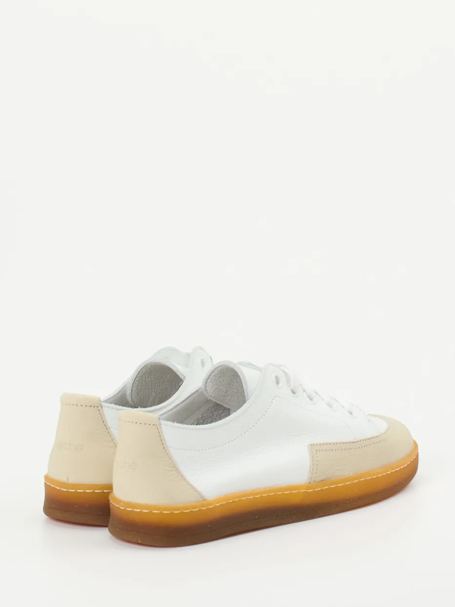 Ideal für entspannte Alltagsmomente überzeugt das Modell mit hochwertigem, ungefüttertem Kalbleder in cleanem Weiß, ergänzt durch sandfarbene Veloursleder-Overlays mit samtiger Textur. Die flache Silhouette trifft auf eine zweifarbige Gummisohle im Retro-Look, deren Profil rutschhemmend wirkt. Dezente Kontrastnähte und der geprägte Markenname an der Ferse setzen stilvolle Akzente. Inspiriert vom Clean Sneaker Look und dem aktuellen Gum Sole Trend lässt sich das Design vielseitig im Casual-Kontext kombinieren – etwa mit Chino und Canvas-Rucksack.