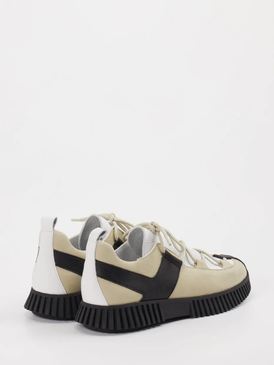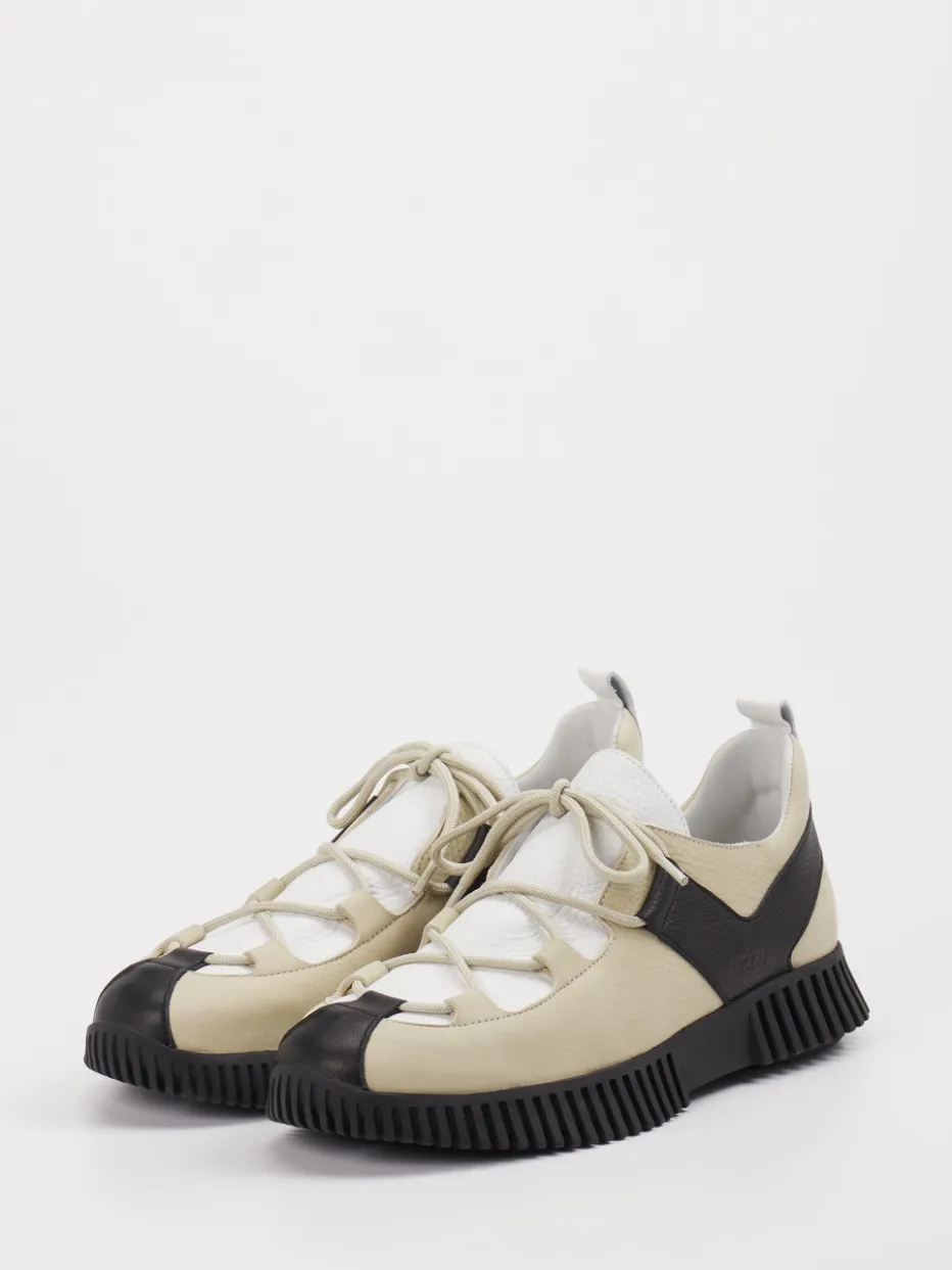 Stil trifft Komfort in moderner Form. Arche bringt mit diesem Sneaker ein Statement-Piece für die Freizeit auf den Punkt. Ideal für sommerliche City-Touren oder entspannte Urlaubstage überzeugt der Sneaker durch sein hochwertiges Hirsch-/Elchleder in genarbter Optik. In Beige gehalten und mit schwarzen sowie weißen Akzenten versehen, entsteht ein spannender Color-Blocking-Effekt. Die flache, kompakte Silhouette sowie die betonte Gummiprofilsohle mit 3,5 cm Absatzhöhe greifen aktuelle Streetwear- und Chunky-Trends auf. Asymmetrische Schnürung und Zuglasche an der Ferse sorgen für sportliche Details. Gut kombinierbar mit entspannten Casual-Outfits in neutralen Tönen. Markentypisch steht Arche für stilvollen Komfort mit avantgardistischer Note.