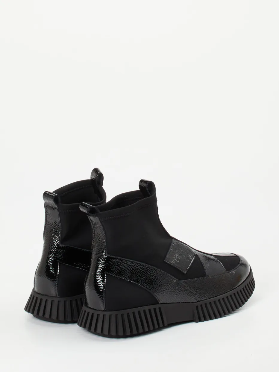 Minimalistisches Statement in Schwarz.Die Marke Arche präsentiert mit dieser Stiefelette eine gelungene Symbiose aus Techno-Ästhetik und Streetstyle. Ideal für urbane Tage, verbinden sich schwarzes Lackleder mit samtartigem Stretchtextil zu einem nahtlosen Gesamtbild. Die knöchelhohe, sockenartige Silhouette passt sich flexibel an, eine strukturierte Gummisohle mit Riffelprofil bietet stabilen Halt. Zuglaschen vorn und hinten setzen sportliche Akzente, während der Gesamtlook von einem puristischen Schwarzton dominiert wird. Die Kollektion spielt auf Trends wie „All Black Everything“ und „Techno Texture AW24“ an und eignet sich perfekt zu Oversized-Silhouetten oder monochromen Styles. Ein Design mit Komfortversprechen – Arche vereint Leichtigkeit, Passform und modische Eigenständigkeit.