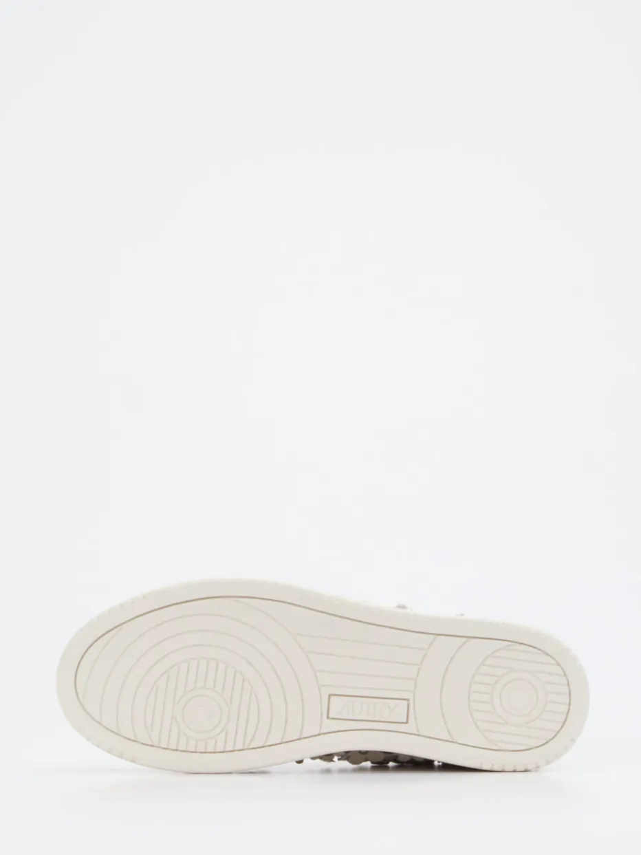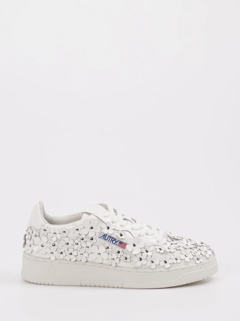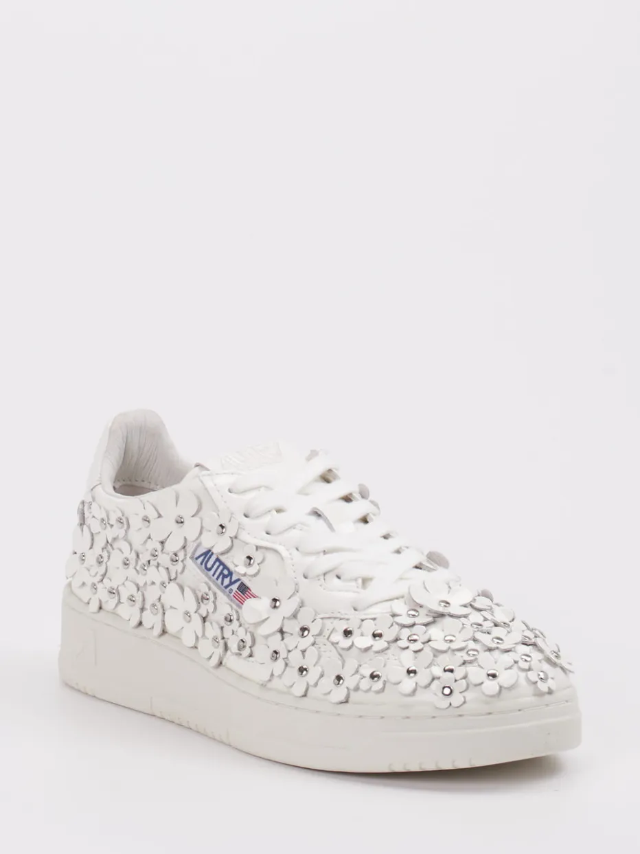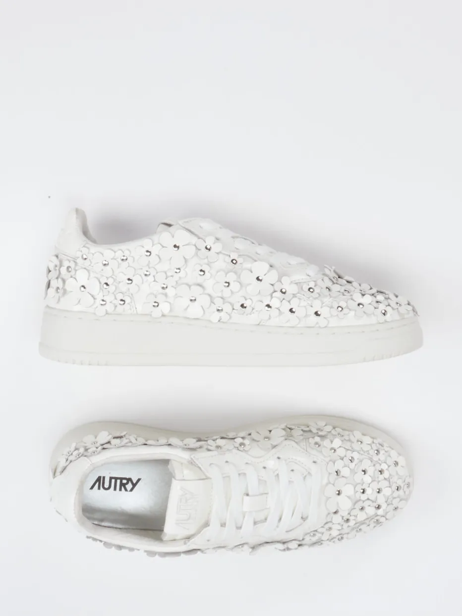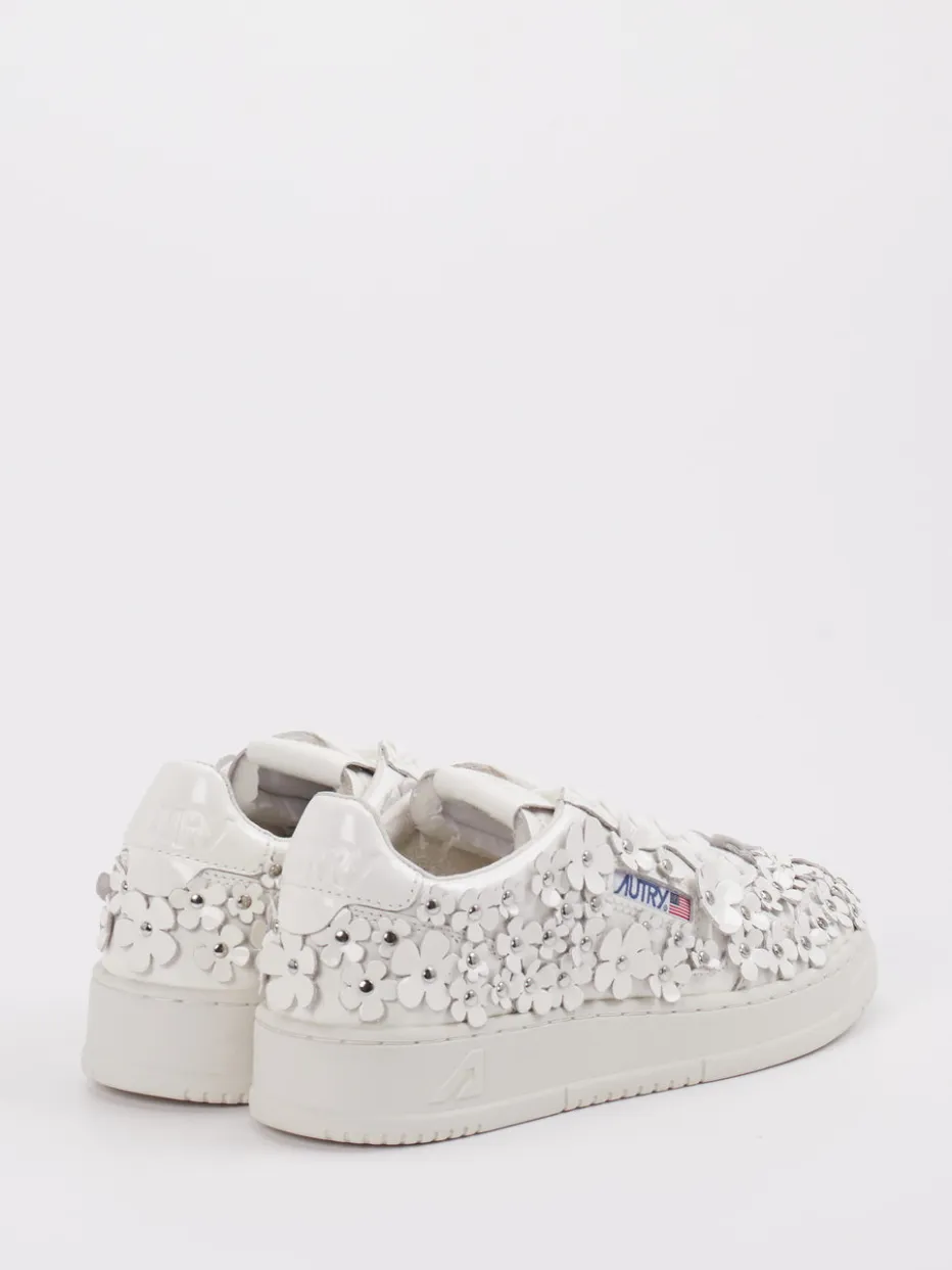 Blütendetails im Y2K-Stil neu interpretiert. Autry präsentiert diesen Damen-Sneaker im Low-Top-Design mit besonderem Blickfang. Ideal für Freizeit und Partys sorgt das Modell mit hochwertigem Lackleder, glänzender Oberfläche und offwhite Farbgebung für einen stilprägenden Auftritt. Die flache Silhouette wird durch florale 3D-Applikationen mit silberfarbenen Nieten und ein seitliches Logo akzentuiert. Eine robuste Gummisohle und klassische Schnürung unterstreichen den Streetwear-Charakter. Der Y2K-Style verbindet sich hier mit einem ausdrucksstarken Fashion-Statement. Ein Blickfang für Individualistinnen mit Stilbewusstsein – markentypisch unkonventionell.