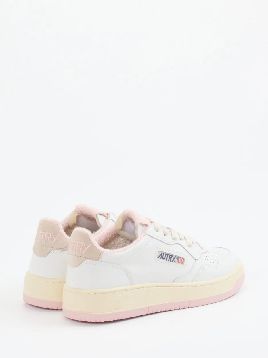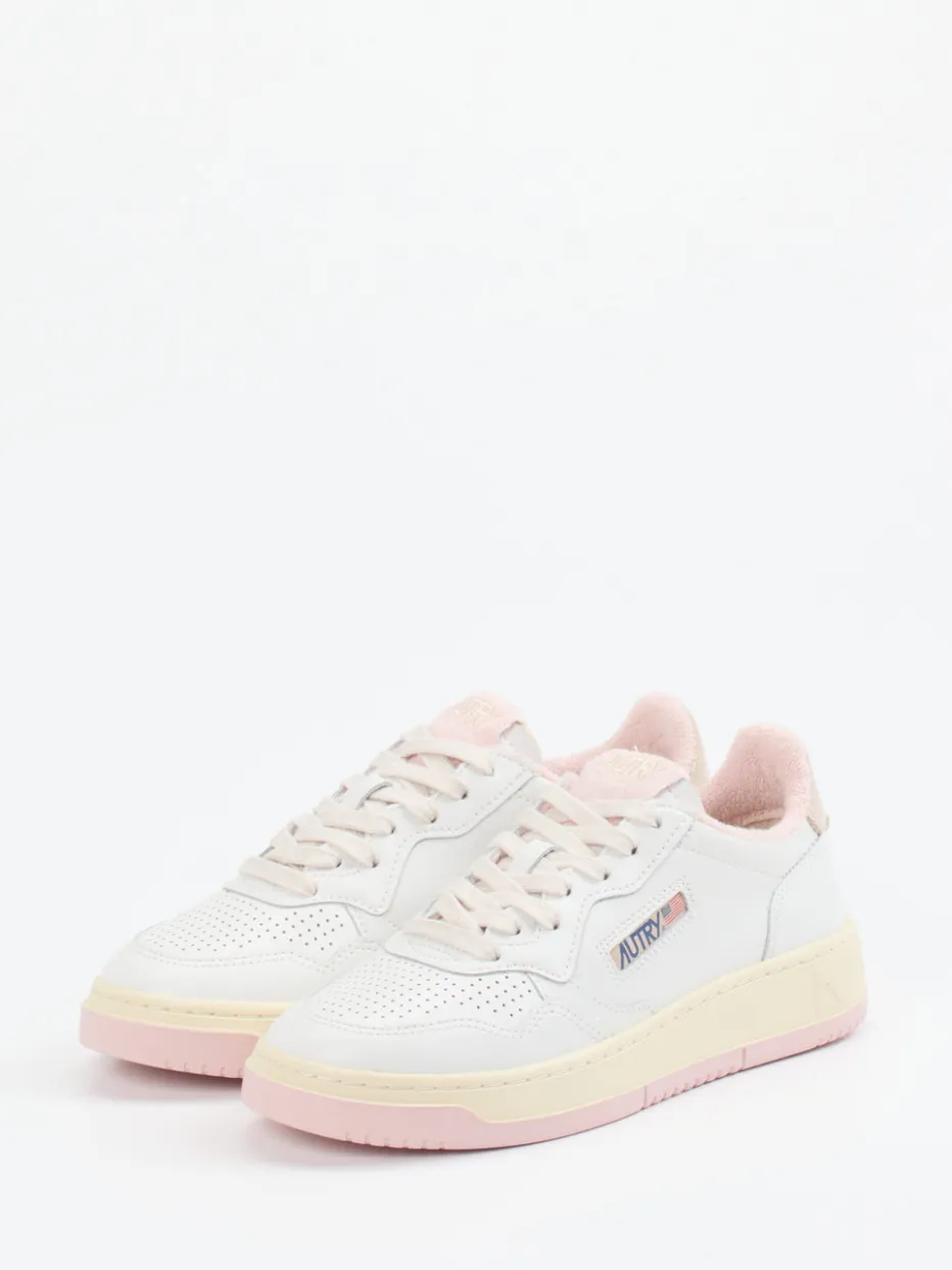 Retro-Flair für entspannte Sommertage. Autry interpretiert den klassischen Damen-Sneaker in einem zurückhaltend-verspielten Stil. Dieser Low-Top-Sneaker verbindet eine Retro-Tennis-Silhouette mit einer Mischung aus glattem Leder, Velours und Frottee. Die perforierte Zehenkappe, pastellrosa und beige Akzente sowie die glänzende Oberfläche setzen dezente Highlights. Mit Schnürung, tonaler Gummisohle und Logo mit Flaggenmotiv fügt sich das Modell harmonisch in minimalistische Casual-Looks ein. Das weiche Innenfutter sorgt für ein angenehmes Tragegefühl, ideal für Reisen oder entspannte Stunden in der Stadt. Besonders stilvoll zu Cropped Jeans oder fließenden Sommerkleidern. Alltagstaugliches Design mit nostalgischem Charme – typisch Autry.
