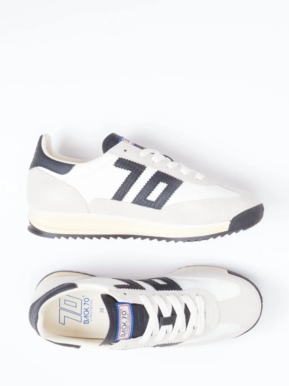 Vintage-Flair mit modernem Komfort.Back 70 interpretiert die Sneaker-Kategorie stilvoll neu. Dieses Retro-Modell spricht besonders jene an, die sportliche Ästhetik mit Trendbewusstsein kombinieren möchten. Das hochwertige Material aus Veloursleder und weißem Nylon wirkt durch die samtig matte Oberfläche edel und leicht. Dezent kontrastiert wird das Offwhite durch schwarze Details in Reptilstruktur und beige Ton-in-Ton-Akzente. Die flache, schlanke Form mit Schnürung harmoniert ideal mit dem texturiertem Patch mit „70“-Prägung an der Seite. Innen punktet atmungsaktives Textilfutter, ergänzt um eine weiche Memory-Foam-Einlage. Die griffige Gummisohle unterstreicht den sportlichen Charakter und bietet Alltagskomfort auf Schritt und Tritt. Ein Trendmodell für Streetstyles mit Retro-DNA. Mit unverwechselbarer Ästhetik setzt Back 70 auf Authentizität und Qualität.