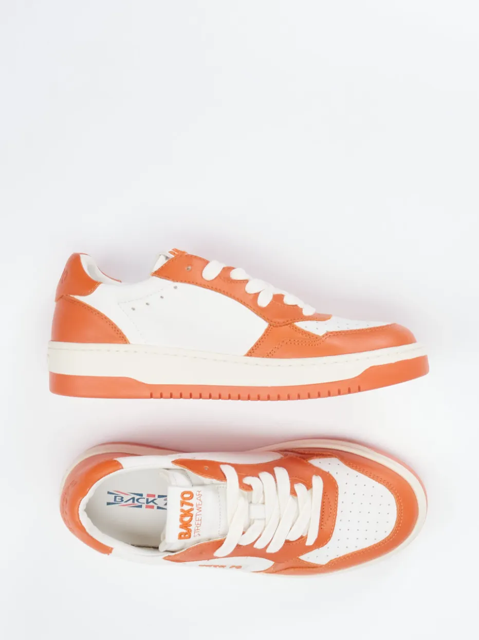 Dieser Low-Top-Sneaker verbindet weißes Glattleder mit orangeroten Overlays und vereint Retro-Basketball-Ästhetik mit modernem Komfort.