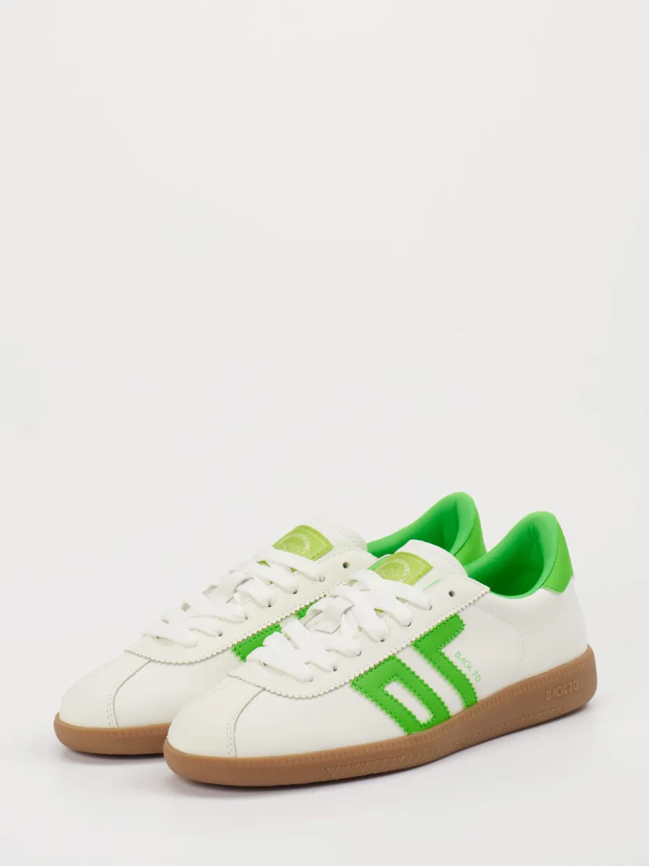 Frischer Auftritt mit Retro-Charme. Back 70 präsentiert einen Low-Top-Sneaker für sportliche Unisex-Styles. Ideal für urbane Freizeitmomente verbindet dieses Modell glattes Kalbleder mit klarer weißer Farbgebung und akzentuierenden Applikationen in Apfelgrün und Karamellbraun. Die klassische Form mit flacher Silhouette, auffälligem Logo-Design und griffig profilierter Gummisohle erinnert an Retro-Sportswear und greift den Y2K-Trend auf. Dank Schnürung und textilgefüttertem Innenraum bietet der Schuh bequemen Halt – auch für Einlagen geeignet. Besonders harmonisch gelingt das Styling mit weißen Socken oder grüner Trainingsjacke. Ein Sneaker, der minimalistisches Design mit markanter Farbgebung kombiniert – typisch Back 70.