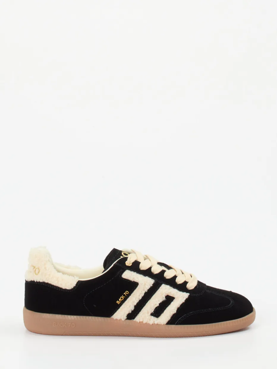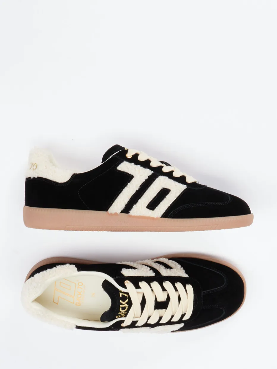 Das Modell aus Velour/Textil kombiniert schwarzes, samtig angeschliffenes Veloursleder mit beigen Teddy-Applikationen und goldenen Logodetails. Die klassische Low-Top-Silhouette mit flacher Cupsohle und kuschelig gepolstertem Schaftrand sorgt für angenehmen Tragekomfort. Inspiriert von Retro-Sportswear setzt das Design starke Streetwear-Akzente und trifft den aktuellen Teddyfutter-Trend der Saison. Ideal kombinierbar zu Oversize-Sweatshirts und Fleece-Joggern.
