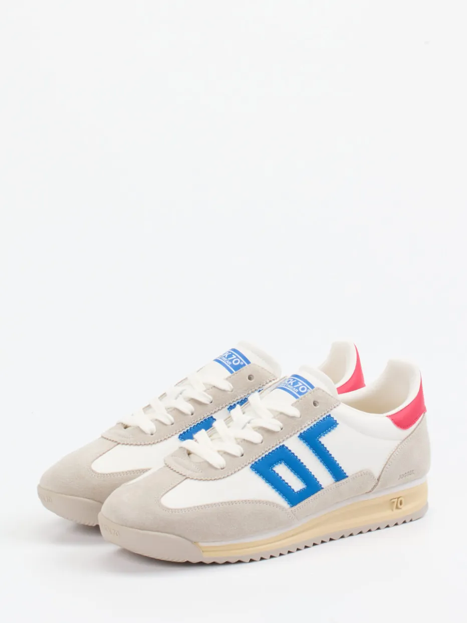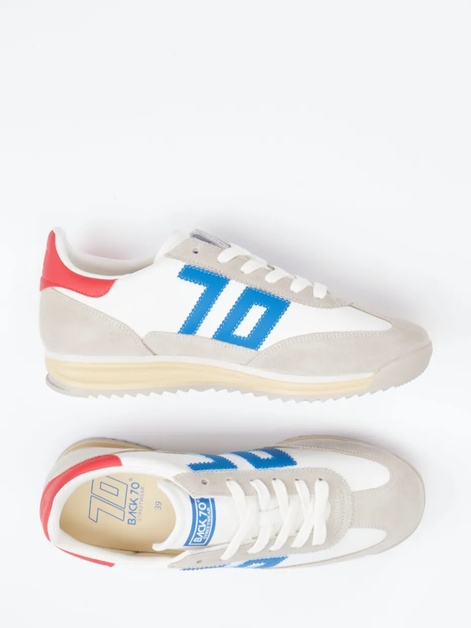 Stilvoller Vintage-Charme mit modernem Komfort.Die Marke Back 70 bringt mit diesem Sneaker italienisches Design und Retro-Flair zusammen. Ideal für urbane Freizeitlooks kombiniert das Modell weiches Kalbleder mit samtigem Veloursleder in Offwhite und Grau. Kontrastierende Details in Rot und Blau – darunter das auffällige seitliche ’70‘-Logo – sorgen für markante Akzente. Die flach zulaufende Silhouette, atmungsaktives Textilfutter und eine stoßdämpfende Gummisohle mit Profilstruktur bieten ganztägigen Tragekomfort. Als Teil des „Retro Runner Revival“-Trends lässt sich der Schuh optimal mit sportlicher Streetwear kombinieren. Ein Statement-Sneaker der Marke Back 70 mit charakterstarker Ästhetik und funktionalem Aufbau.