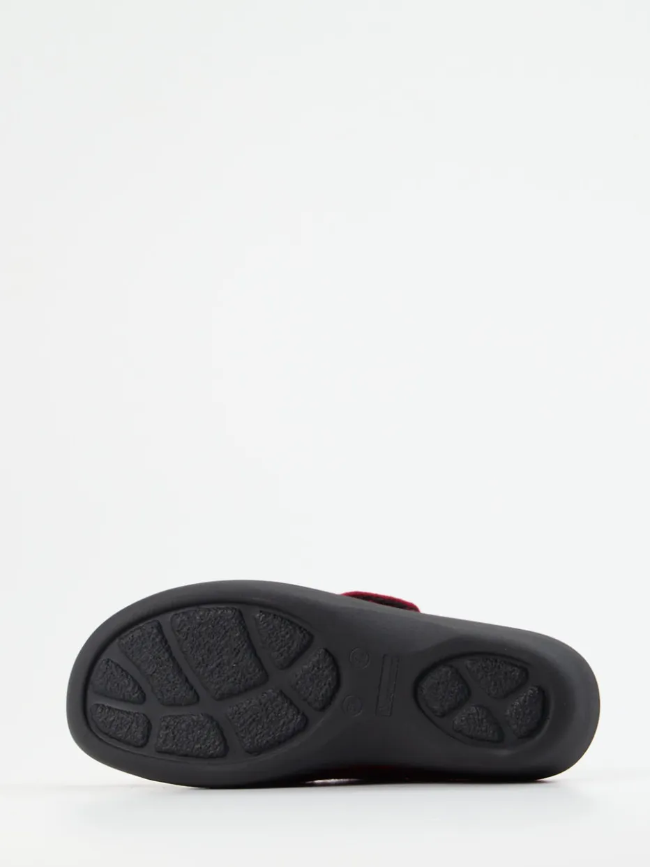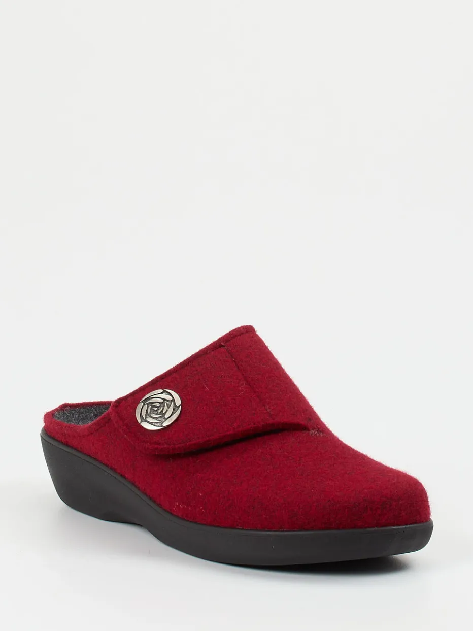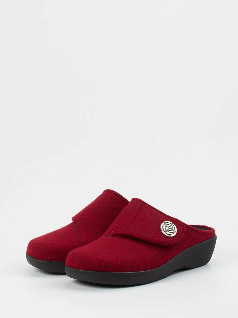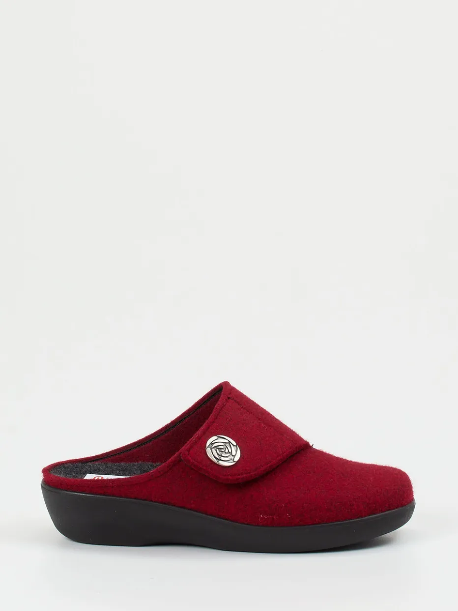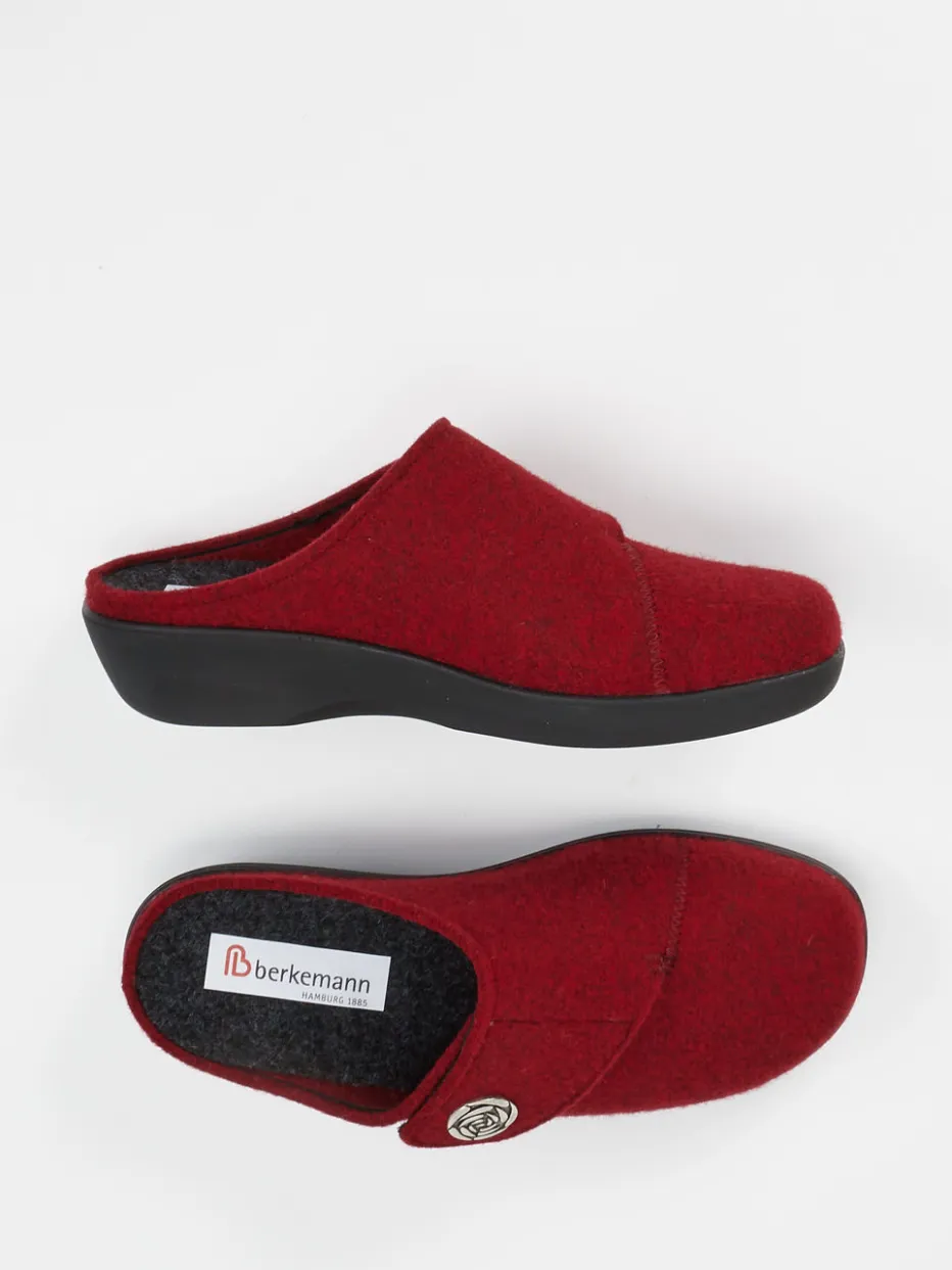Komfort trifft Design im Winteralltag.Der Damenhausschuh Teresa von Berkemann bietet entspannten Wohnkomfort im stilvollen Look. Ob beim Morgenkaffee oder abends vorm Kamin – der dunkelrote Filzpantoffel mit mattierter Oberfläche schenkt wohltuende Wärme und ein angenehmes Tragegefühl. Die geschlossene Front und offene Ferse sorgen für einfaches Hineinschlüpfen, während der Klettverschluss mit silberfarbenem Rosenknopf einen dekorativen Akzent setzt. Die ergonomisch geformte Gummisohle ist leicht keilförmig und verleiht sicheren Halt auf glatten Böden. Ideal für Liebhaberinnen minimalistischer Cozywear mit gemütlicher Ausstrahlung. Ein durchdachtes Wohlfühlprodukt mit Qualitätssignatur von Berkemann.