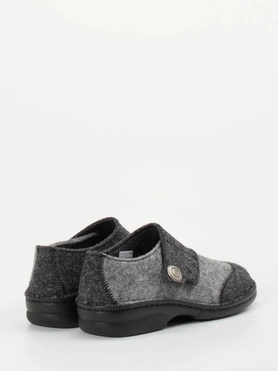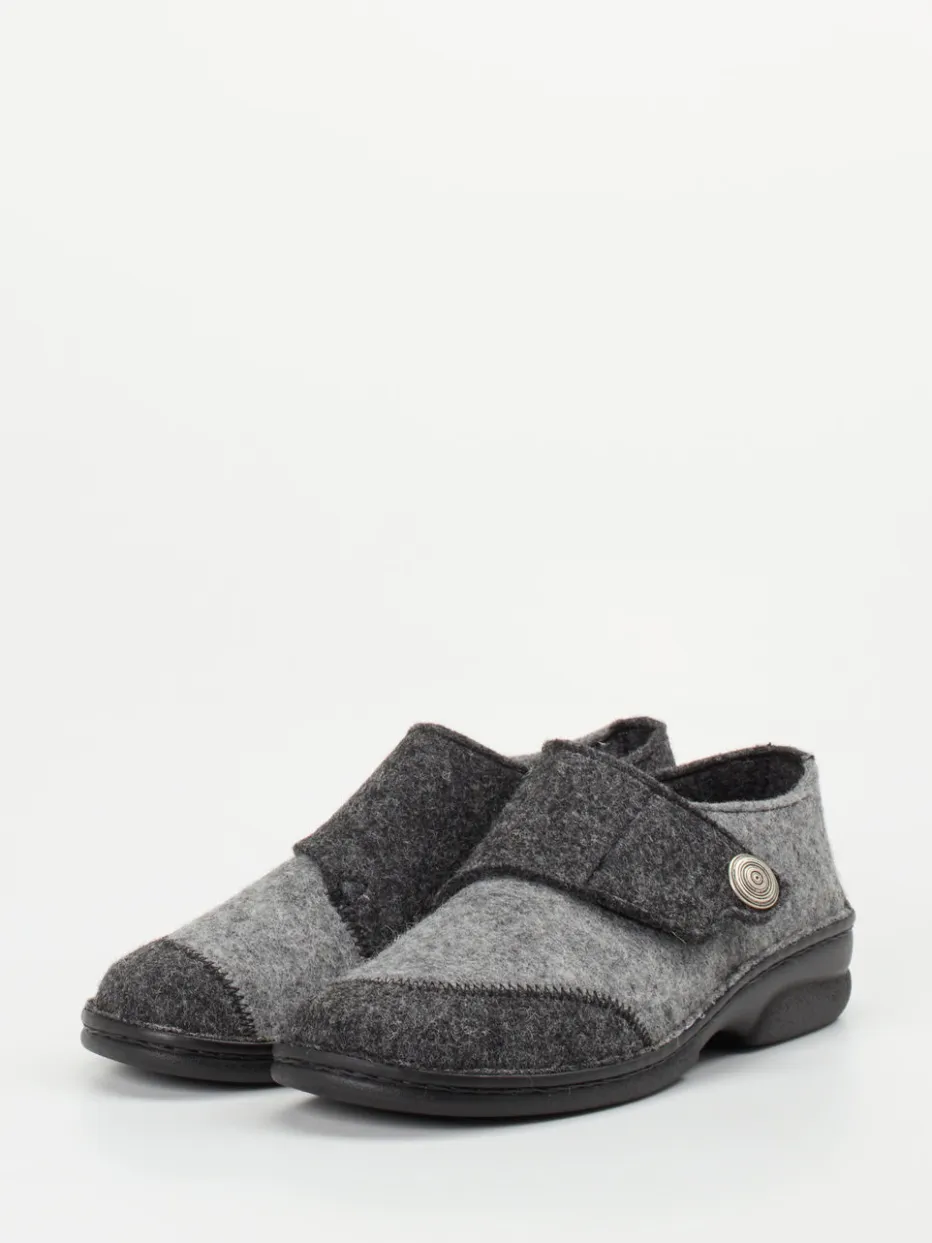 Wärme trifft Komfort im Alltag.Berkemann präsentiert einen Damen-Hausschuh, der behaglichen Komfort stilvoll umsetzt. Ideal für entspannte Tage rund ums Haus überzeugt das Modell mit einem Obermaterial aus samtig-filzigem Wollfilz in hell- und dunkelgrauen Nuancen. Die geschlossene, rund geformte Silhouette wird durch einen breiten Klettverschluss mit dekorativem Spiral-Zierknopf ergänzt. Innen sorgt eine warme Textilfaser für Wohlgefühl, während die ergonomisch geformte Gummilaufsohle rutschhemmend wirkt. Das Design folgt der ruhigen Eleganz des Quiet-Luxury-Trends und unterstreicht ein natürlich inspiriertes Wohngefühl. Besonders harmonisch zu Wollsocken oder lässigem Hausanzug. Berkemann bietet hier kompromisslose Funktion in alltagstauglich-reduzierter Form.