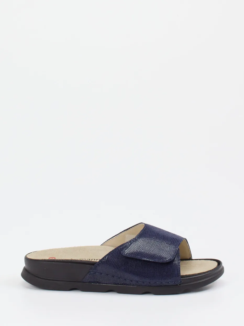 Schimmernder Komfort für jeden Tag.Die Marke Berkemann steht für durchdachte Bequemschuhe – diese Damen-Pantolette ist ein gutes Beispiel. Ob beim Frühstück auf der Terrasse oder beim gemütlichen Stadtbummel: Das geprägte Leder in tiefem Dunkelblau mit dezentem Glanz und Ton-in-Ton-Nähten verleiht dieser offenen, ergonomisch geformten Sandale ihr modernes Erscheinungsbild. Zwei Klettverschlüsse sorgen für optimalen Sitz, die gepolsterte Innensohle ist mit Veloursleder bezogen und eignet sich auch für eigene Einlagen. Die leichte PU-Sohle gibt Halt und unterstützt beim Gehen. Design und Funktion folgen dem Trend zu „Functional Footwear“ mit minimalistischer Eleganz. Berkemann überzeugt mit alltagstauglicher Ergonomie und hochwertiger Verarbeitung.