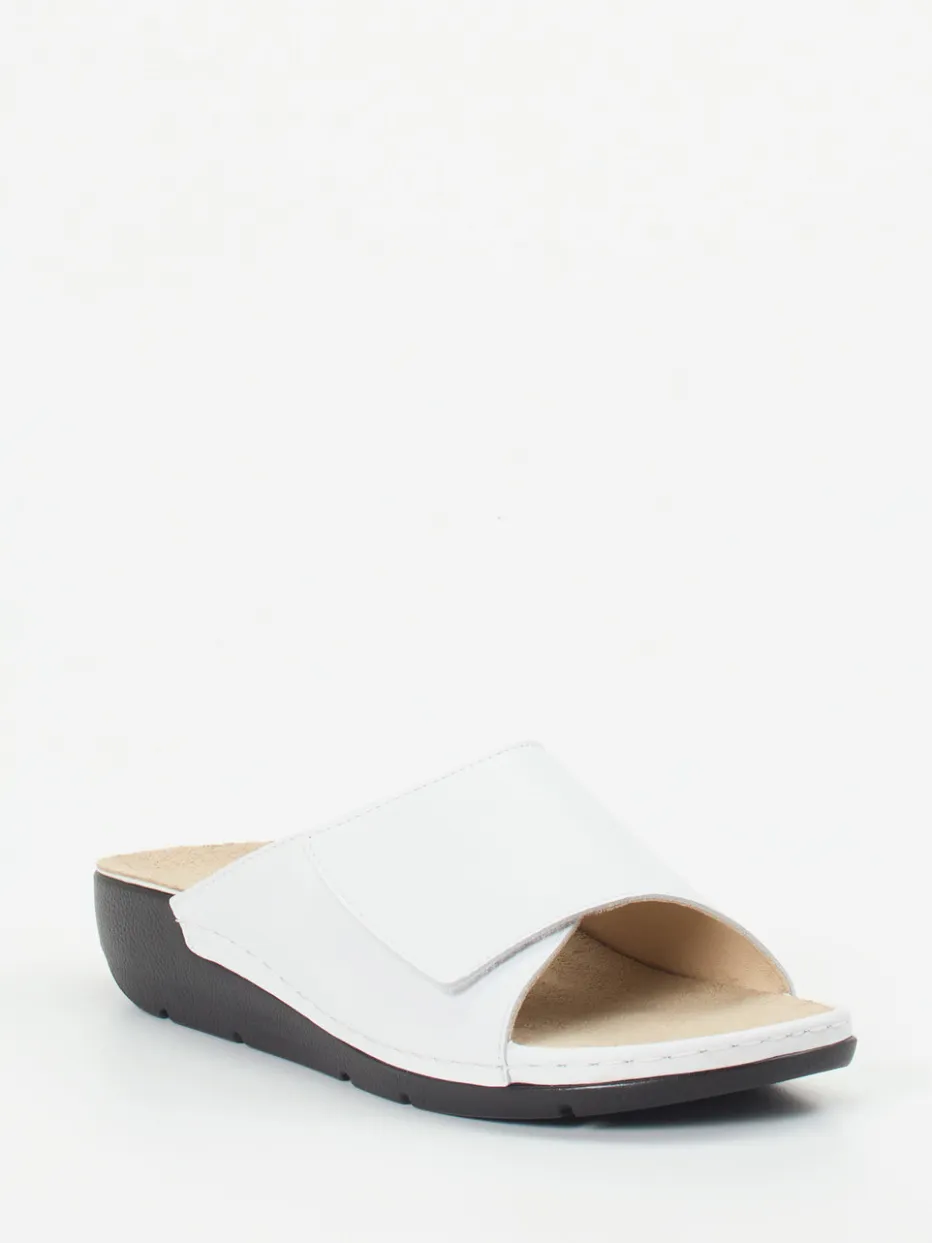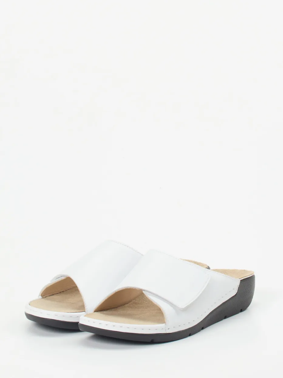 Schlicht. Komfortabel. Alltagstauglich.Die Damen-Pantolette von Berkemann vereint reduziertes Design mit durchdachter Funktionalität. Ideal für entspannte Sommertage zu Hause oder unterwegs bietet das Modell aus weißem Kalbleder mit glänzender Oberfläche eine ergonomische Passform. Der breite Riemen mit Klettverschluss ermöglicht eine individuelle Weiteneinstellung. Ein Highlight: Die gepolsterte, waschbare Innensohle lässt sich bei Bedarf gegen eigene Einlagen tauschen. Die Keilsohle mit Profil sorgt für sicheren Stand und ein angenehmes Laufgefühl. Sichtbare Kontrastnähte unterstreichen den hochwertigen Look mit minimalistischem Charakter. Beratungskomfort mit Fokus auf Langlebigkeit und Wohlbefinden – das ist Berkemann.