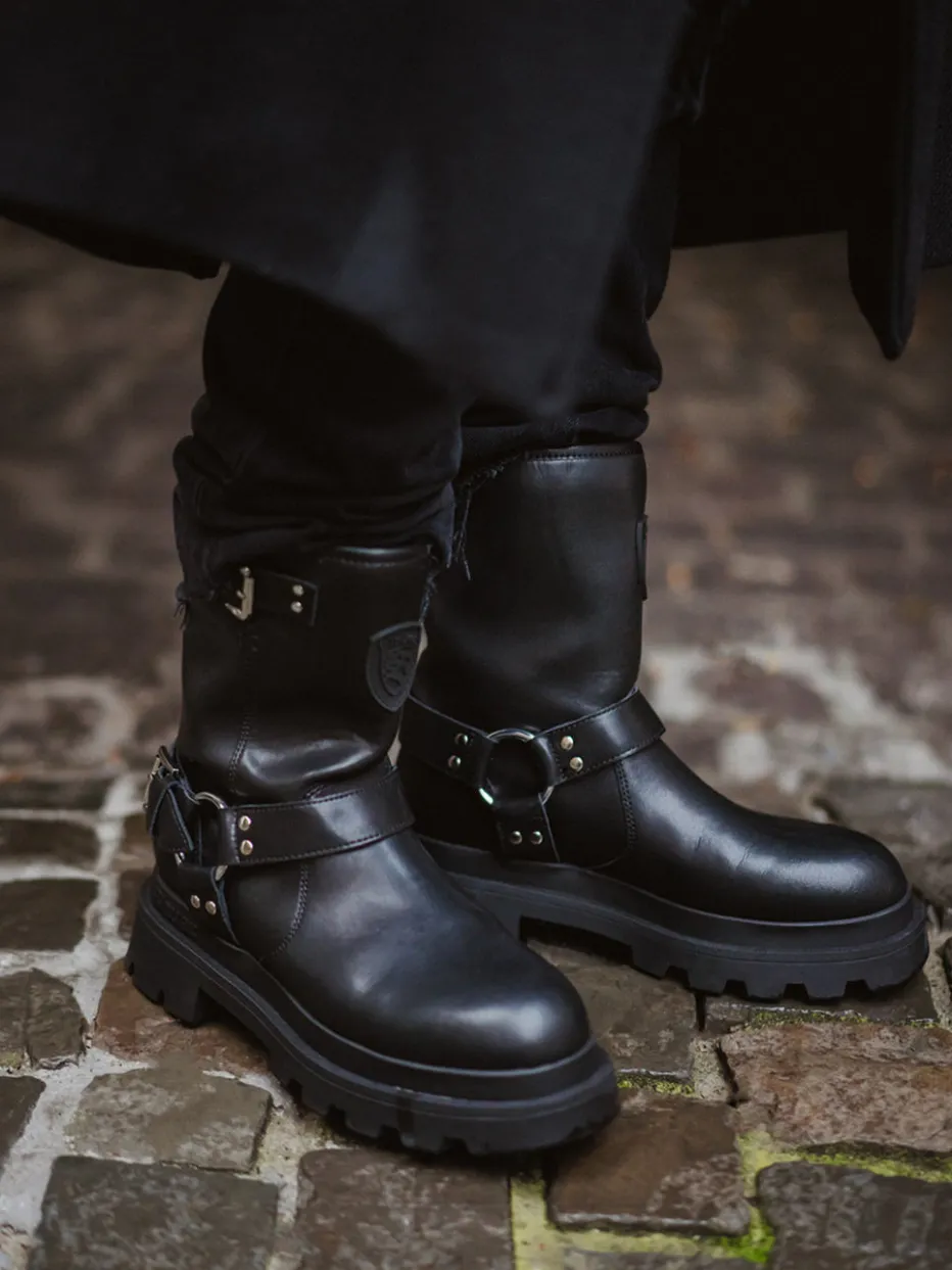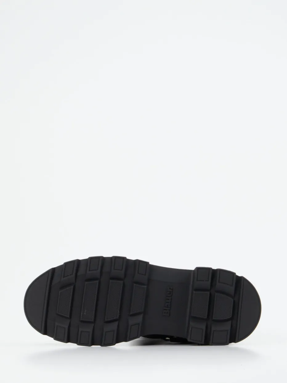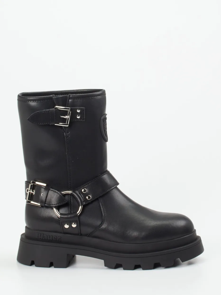 Diese Biker-Stiefelette von Blauer kombiniert robustes Kalbleder mit markanter Hardware für einen selbstbewussten Auftritt. Die Profilsohle sorgt dabei für Komfort und Grip im Alltag.