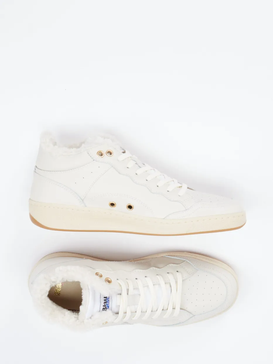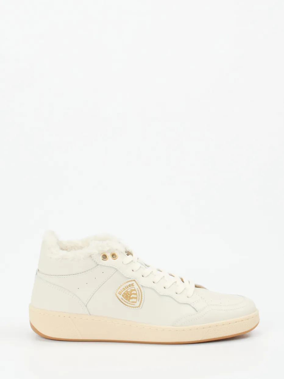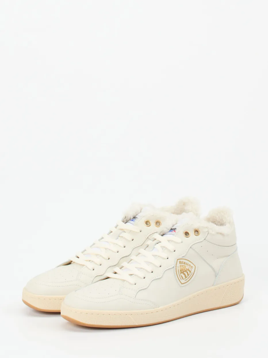Der warme Mid-Top-Sneaker von Blauer verbindet glattes Kalbleder mit kuscheligem Innenfutter und stilvollen Goldakzenten – perfekt für kühle Tage in der Stadt.