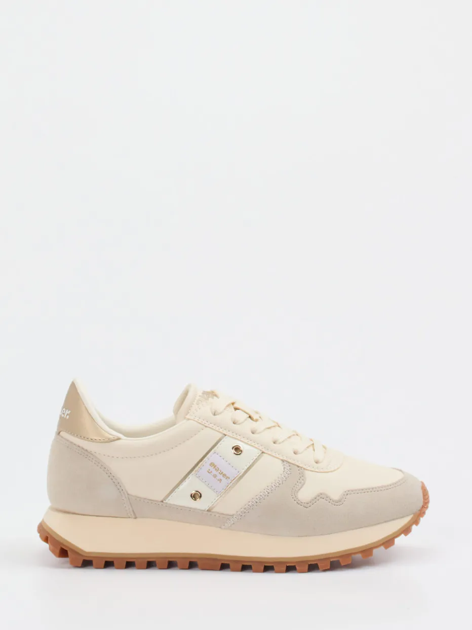 Der Sneaker von Blauer bringt Retro Runner Feeling in den Alltag. Optisch setzt das Modell auf natürliche Creme- und Beigetöne mit goldfarbenen Ösen und Logo-Print für einen dezenten Luxus-Twist.