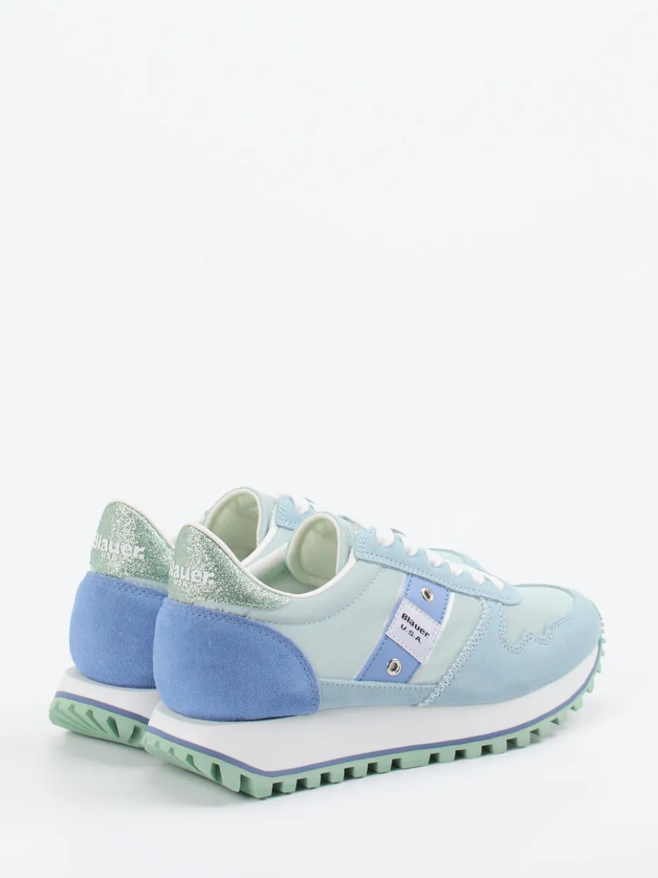 Pastell trifft Retro-Charme.Die Marke Blauer präsentiert einen modischen Damen-Sneaker mit Retro-Runner-Silhouette. Ideal für entspannte Citytage im Sommer kombiniert das Modell hochwertiges Veloursleder mit matt strukturiertem Mesh und Textil. Der sanfte Pastellblauton mit mintgrünen und babyblauen Akzenten unterstreicht die Streetwear-Ausrichtung. Glitzerdetailing an der Ferse sorgt für einen subtilen Y2K-Twist. Die flache Form, bequeme Gummisohle und griffiges Profil bieten Komfort und Trittsicherheit. Perfekt zu Cropped-Jeans oder fließenden Sommerkleidern. Ein trendbewusster Alltagsbegleiter mit authentischem Blauer-Finish.