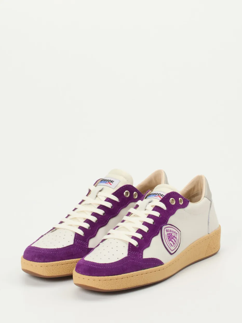 Cooler Streetstyle trifft Retro-Spirit.Blauer präsentiert mit diesem Unisex-Sneaker einen stilvollen Streetwear-Klassiker. Ideal für trendbewusste Alltagsmomente: Der Schuh kombiniert fein genarbtes Kalbleder in Offwhite mit samtigem Veloursleder in Violett und sorgt durch seine matt gehaltene Farbgebung für ein modernes Erscheinungsbild. Die perforierte Zehenpartie, seitliche Logo-Details und ein Kontrastbesatz unterstreichen die Sportlichkeit. Innen setzt Blauer auf ein weiches Leder-Textilfutter und eine herausnehmbare Innensohle. Die flexible Gummisohle bietet Komfort bei Freizeit und Ausgehen. Die Silhouette bleibt flach und alltagstauglich. Ein Sneaker, der Retro-Vibes authentisch und präzise in die Jetztzeit übersetzt.