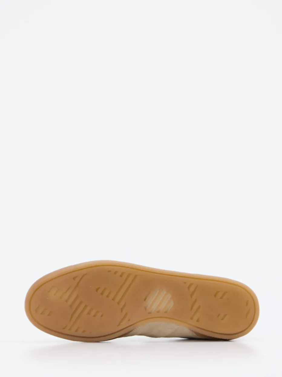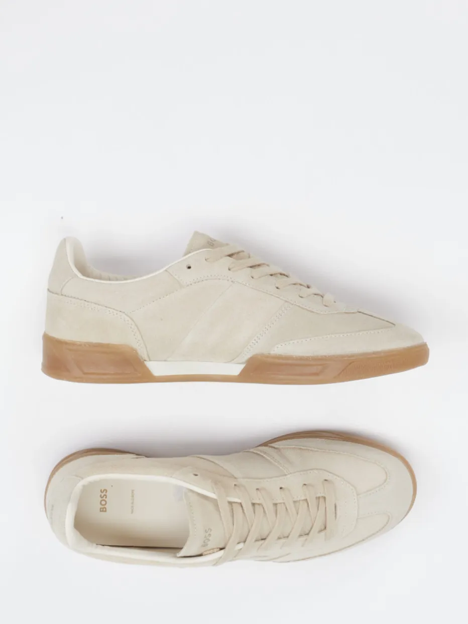 Stilvoller Minimalismus für urbane Looks. Boss präsentiert mit diesem Herren-Sneaker ein Modell, das dezente Eleganz und Alltagstauglichkeit vereint. Ob für den Weg ins Büro oder am Wochenende in der Stadt – das Veloursleder in softem Beige trifft auf eine karamellfarbene Gummisohle und verleiht dem Schuh eine ruhige und hochwertige Anmutung. Die matte Oberfläche, die klassische flache Silhouette und die Ton-in-Ton-Nähte unterstreichen den Clean Look. Eine dezente Logo-Prägung sowie der gepolsterte Einstieg runden das zurückhaltende Design funktional ab. Inspiriert vom Retro-Sportswear-Stil, passt der Sneaker ideal zu Chinos oder monochromen Casual-Outfits. Der zeitlose Charakter bringt moderne Understatement-Looks auf den Punkt – für alle, die subtile Klasse bevorzugen.