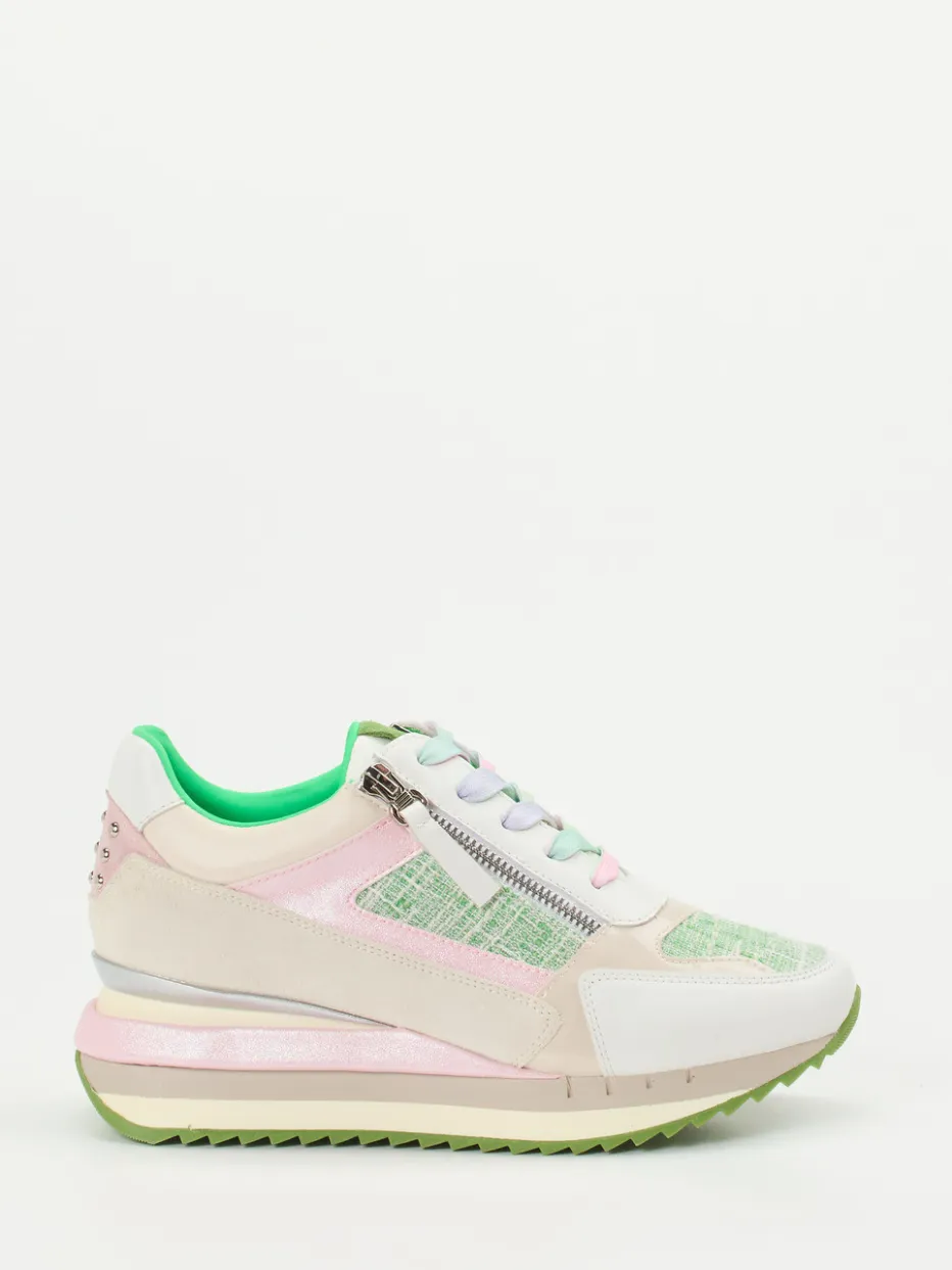 Chunky trifft Farbharmonie.CAFèNOIR liefert mit diesem Sneaker ein ausdrucksstarkes Modell im Trendformat. Wenn ein Alltagslook mehr Ausdruck bekommen soll, bringt dieser Chunky-Sneaker Abwechslung in jedes Styling. Glattes Kalbleder, samtig angeschliffenes Veloursleder sowie strukturierter Textilbesatz vereinen sich zu einer spannenden Oberfläche. Der pastellfarbene Verlauf, silberfarbene Details und changierende Schnürsenkel sorgen für Hingucker-Momente. Die erhöhte Keilsohle mit ihren farblich abgestuften Layern bietet Komfort und einen urbanen Y2K-Look. Ideal zu Oversized-Silhouetten und pastelligen Accessoires. Ein Sneaker mit starkem Designfokus für trendorientierte Auftritte.