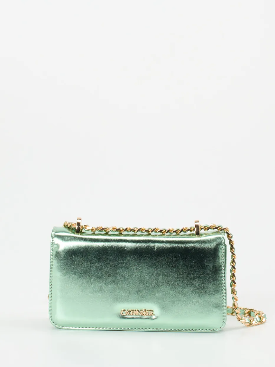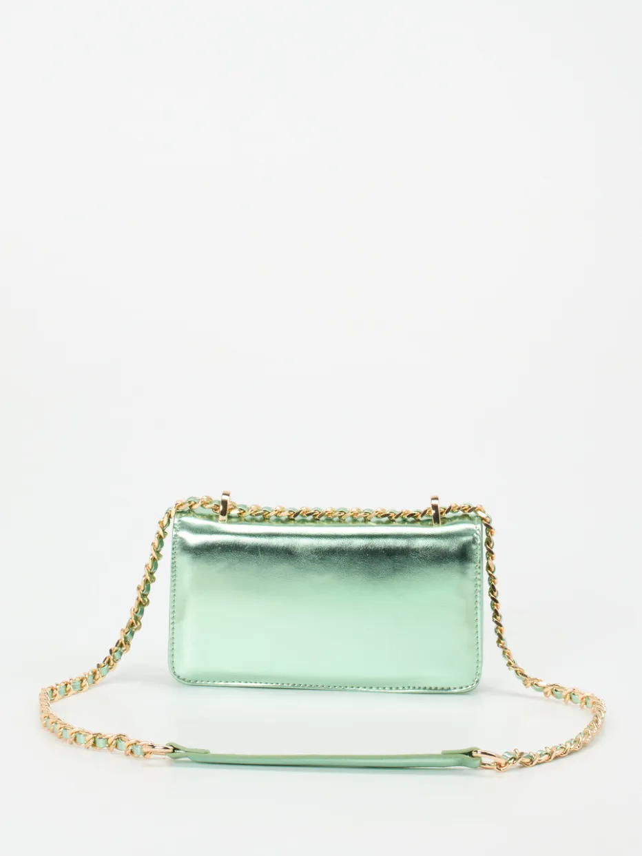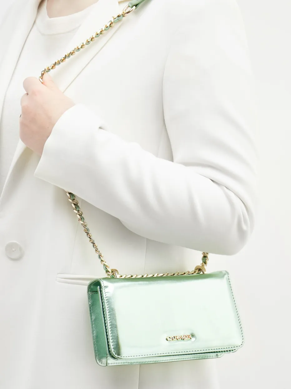 Diese Schultertasche von CAFèNOIR kombiniert glänzendes Metallicleder in Pistaziengrün mit goldfarbener Kette zu einem Y2K-inspirierten Mini-Statement.