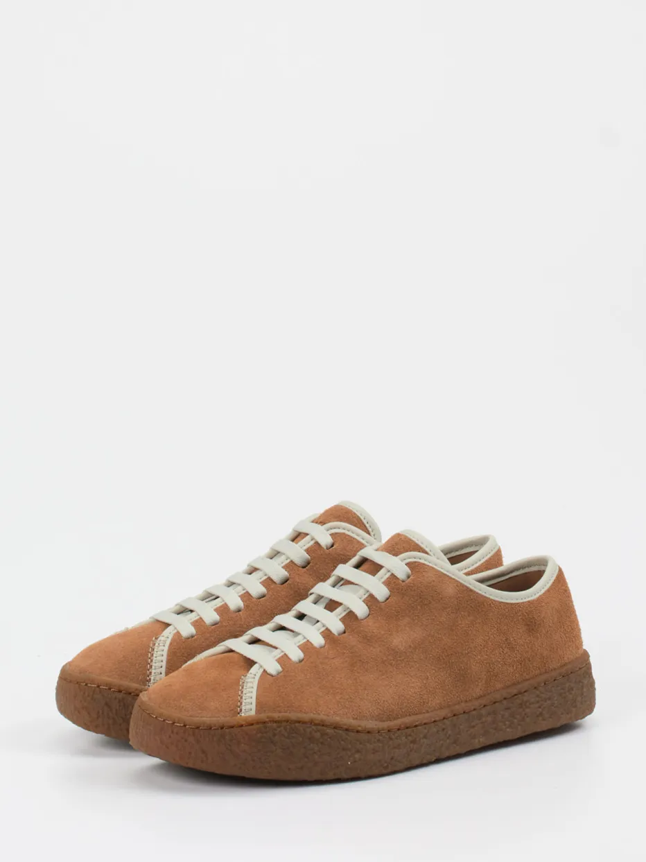 Retro-Mood in Naturtönen. Camper bietet mit diesem Sneaker ein stilsicheres Freizeitmodell im Low-Top-Design. Die matte Oberfläche aus Veloursleder zeigt sich in intensivem Cognacbraun, ergänzt durch cremeweiße Kontrastnähte und Schnürung. Die klassische runde Silhouette und die strukturierte Kreppsohle aus Gummi unterstreichen den Retro-Charakter und sorgen für Rutschfestigkeit. Ideal für entspannte Alltagsmomente – von urbanen Spaziergängen bis zum Wochenendrelaxen. Der Verzicht auf Glanzelemente und die Naturgummi-Anmutung setzen ein stilles Statement zu „Quiet Luxury“ und Nachhaltigkeit. Ein Sneaker mit Stil und Haltung – komfortorientiert und modern gedacht.