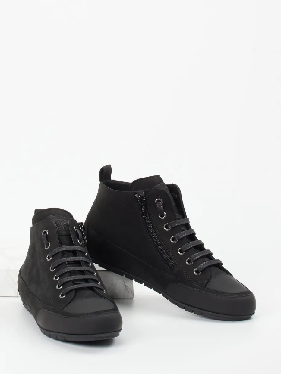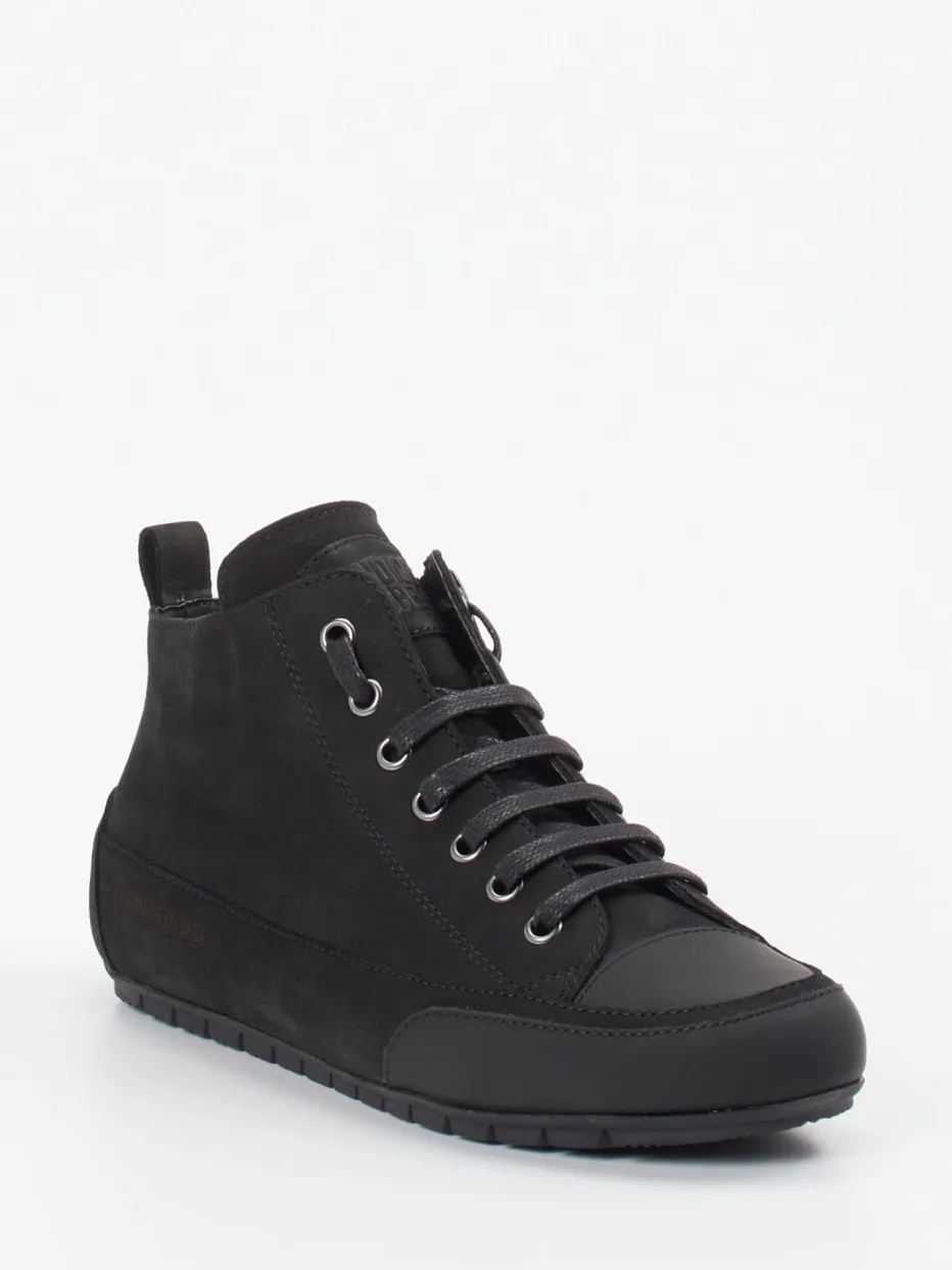 Dieser Mid-Top-Sneaker von Candice Cooper vereint minimalistisches Design mit praktischer Alltagstauglichkeit. Das samtig angeschliffene Nubukleder in tiefem Schwarz wird durch tonal abgesetzte Zehen- und Fersenkappen sowie silberfarbene Metallösen akzentuiert. Die klassische, schmale Silhouette wird durch eine Kombination aus Schnürung und seitlichem Reißverschluss ergänzt, der das Anziehen erleichtert. Eine flexible Gummisohle mit rutschfestem Profil sowie das anschmiegsame Kalblederfutter stehen für hohen Komfort. Perfekt für monochrome Streetwear-Looks der aktuellen Saison. Stylisch zu Jogpants oder urbanen Casual-Outfits kombinierbar. Herausnehmbare Innensohle und Zuglasche erhöhen den markentypischen Komfort im Alltag.