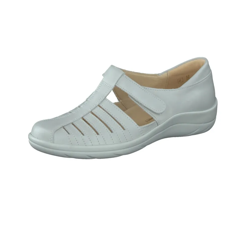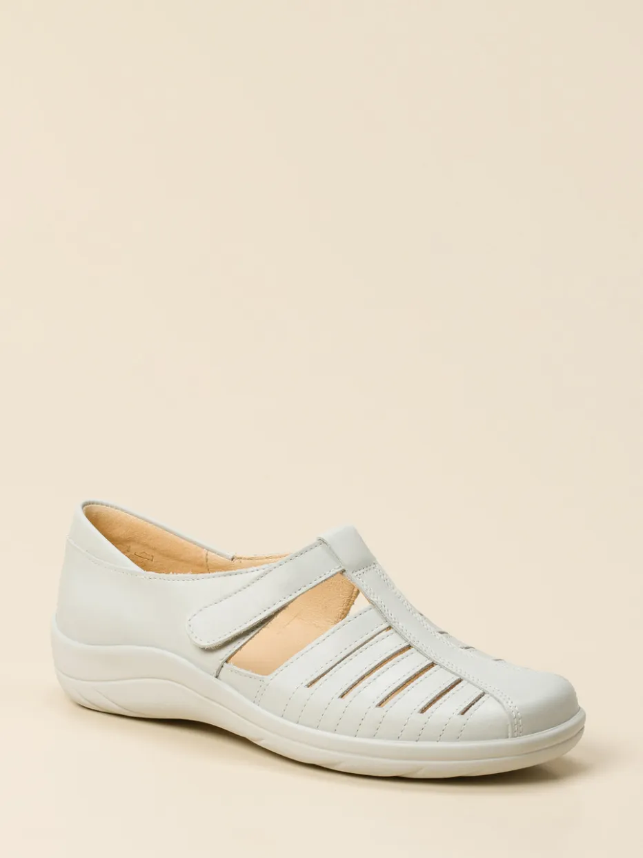 Diese feminine Komfort-Sandale kombiniert weiches Kalbleder mit atmungsaktiven Lasercuts und funktionalem Klettverschluss. Ideal für warme Tage im Alltag mit besonders bequemer Passform.