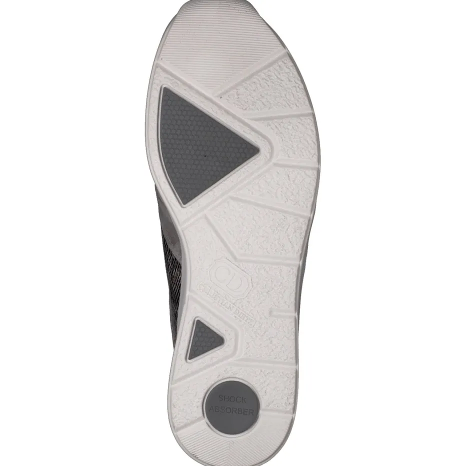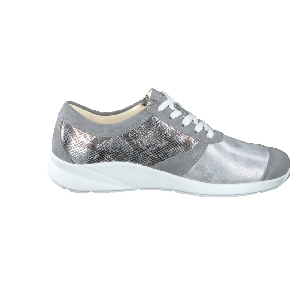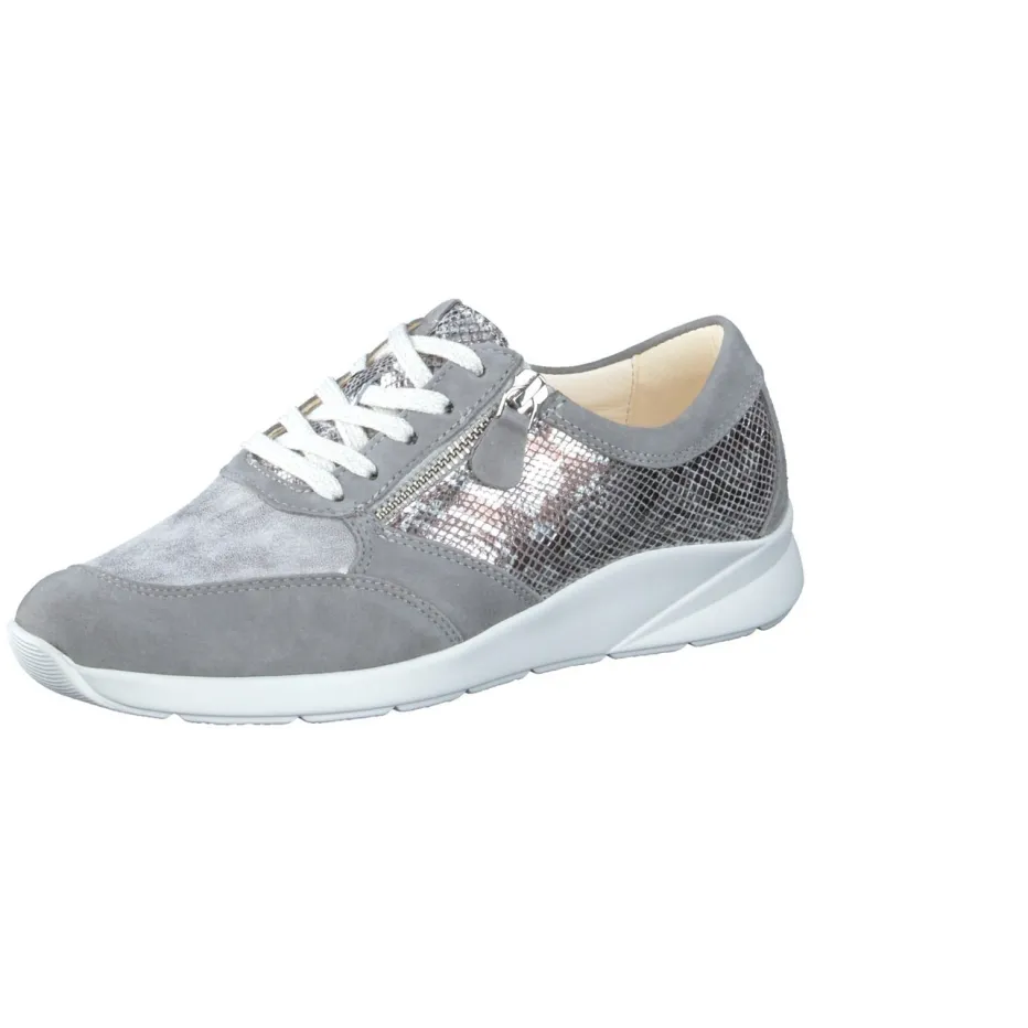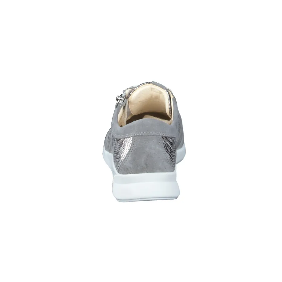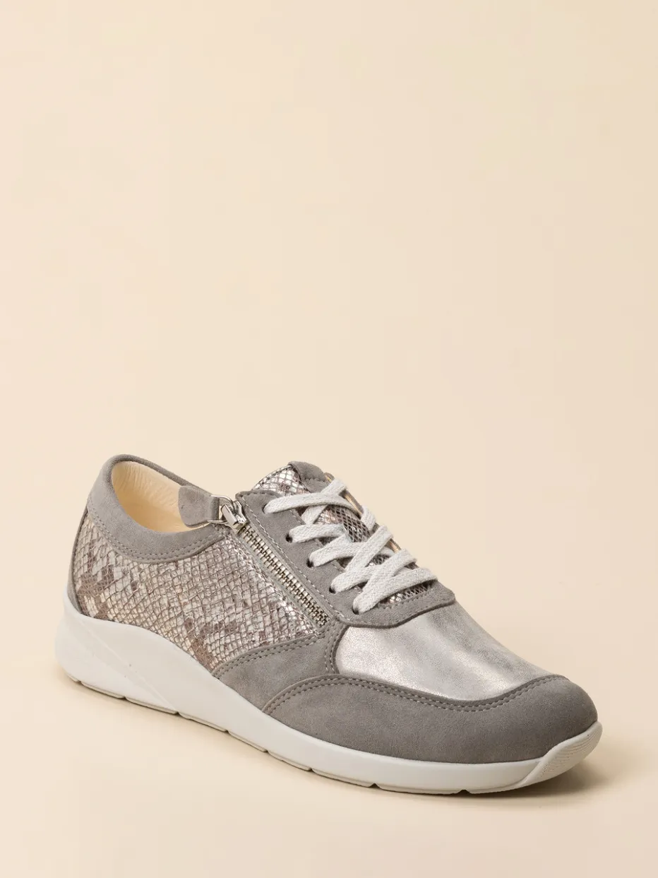 Für entspannte Stadtspaziergänge oder den Arbeitsweg überzeugt das Modell durch weich gepolstertes Fußbett und rutschfeste Gummisohle mit Shock Absorber. Die hochwertige Materialkomposition kombiniert samtig-mattes Veloursleder in Steingrau mit silberfarbenem Metallic-Druckleder in Schlangenhaut-Prägung. Hellgraue Kalblederdetails und helle Schnürsenkel unterstreichen den modernen Minimalismus. Praktisch: Der seitliche Reißverschluss ermöglicht schnelles An- und Ausziehen. Perfekt kombinierbar zu Softshelljacken und Crossbody-Bags in Graunuancen.