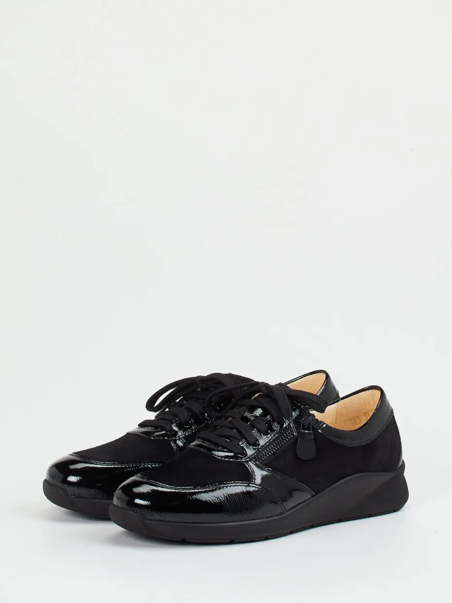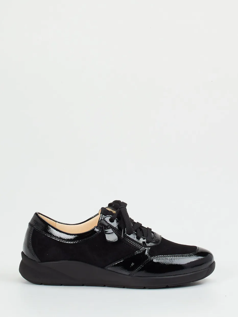 Dieser Komfort-Sneaker überzeugt mit edler Materialkombination aus samtigem Veloursleder und glänzendem Lackleder – funktional ergänzt durch Reißverschluss und herausnehmbares Fußbett.