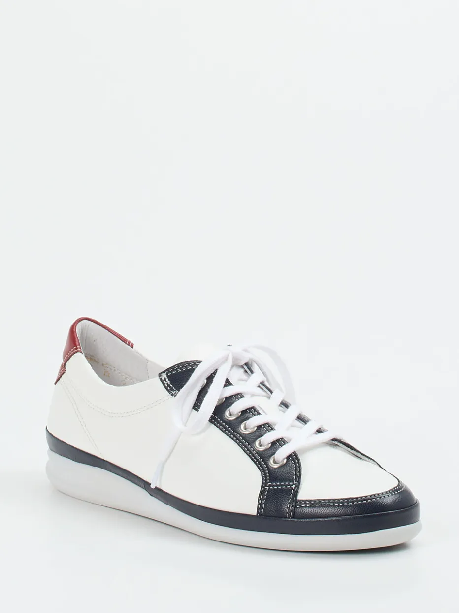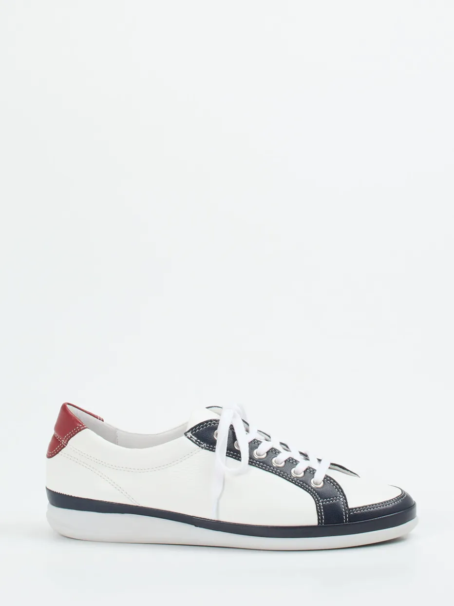 Maritimer Look trifft Komfortanspruch.Christian Dietz präsentiert mit diesem Sneaker ein modisches Highlight für Damen. Für entspannte Tage und stilvolle City-Looks bietet das weiche, genarbte Kalbleder in Weiß mit dunkelblauen und bordeauxroten Elementen eine frische, maritime Ästhetik. Kontrastnähte, silberfarbene Ösen und ein farblich abgesetzter Fersenbereich akzentuieren die klassisch flache Silhouette. Die komfortable G-Weite, gepolsterte Luftpolstersohle sowie die Einlagentauglichkeit unterstreichen die ergonomische Funktionalität. Perfekt für casual-outfits mit weißen Basics oder navyfarbenen Accessoires. Ein Wohlfühl-Sneaker mit durchdachtem Design – made by Christian Dietz.