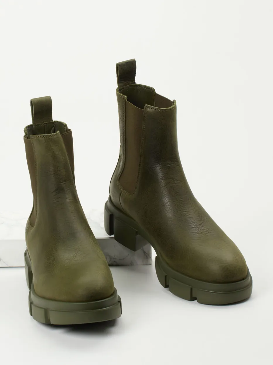 Diese olivgrünen Chelsea Boots verbinden robuste Minimalästhetik mit modischer Streetwear-Tauglichkeit. Hochwertiges Nubukleder trifft auf eine profilierte Chunky-Sohle.