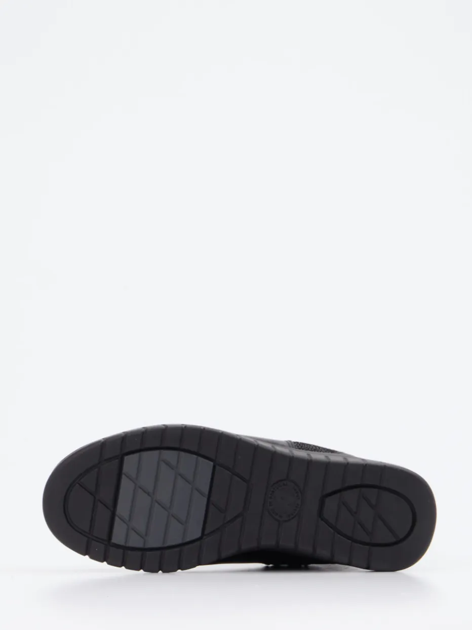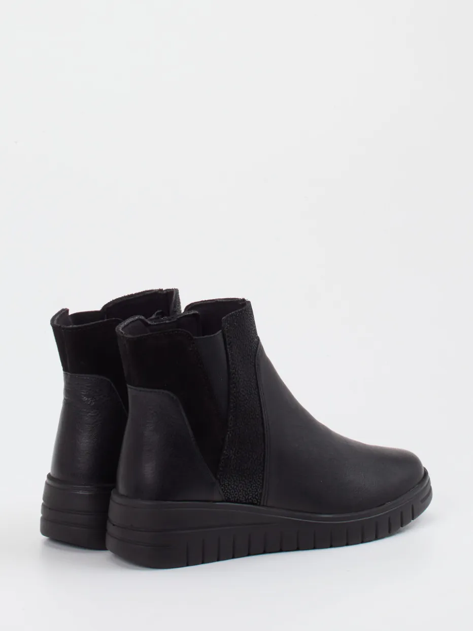 Komfort trifft minimalistischen Chic.Cypres Soft präsentiert eine Damen-Stiefelette aus feinem Kalbleder für Alltag und Beruf. Die knöchelhohe Form mit rund zulaufender Silhouette sowie Elastikeinsatz und Reißverschluss bieten hohen Tragekomfort. Das matte, schwarze Leder wird seitlich von einem tonalen Struktur-Detail akzentuiert. Eine weiche Gummisohle mit Profil sorgt für Grip und unterstützt das Komfortkonzept. Dezente Prägung und die schlichte Optik positionieren das Modell im Stilfeld von Quiet Luxury und Comfort Core. Besonders gut kombinierbar mit schmalen Hosen und cleanen Oberteilen. Cypres Soft steht für durchdachte Passform mit stilvollem Understatement.