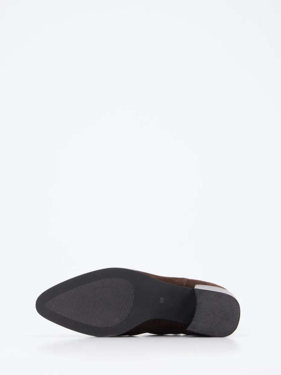 Stilvoll durch Herbst und Winter.Die Marke Di Lauro präsentiert mit dieser Damen-Stiefelette im Chelsea-Stil ein Modell, das klassische Linien mit modernen Akzenten kombiniert. Ideal für urbane Alltagsmomente oder den stilvollen Büroauftritt: Dunkelbraunes Veloursleder, samtig angeschliffen und mit feiner Struktur, prägt die matte Oberfläche. Seitliche Elastikeinsätze, tonige Nähte und praktische Zuglaschen unterstreichen die minimalistische Silhouette. Der 4,5 cm hohe Blockabsatz aus Gummi bietet Komfort und Trittsicherheit. Trendbewusste setzen mit dem „Quiet Luxury“-Look auf Understatement. Perfekt kombiniert mit Wollmänteln und Accessoires in Naturtönen – dezent, edel und vielseitig tragbar. Ein Di Lauro Klassiker mit wertigem Finish und saisonübergreifender Eleganz.