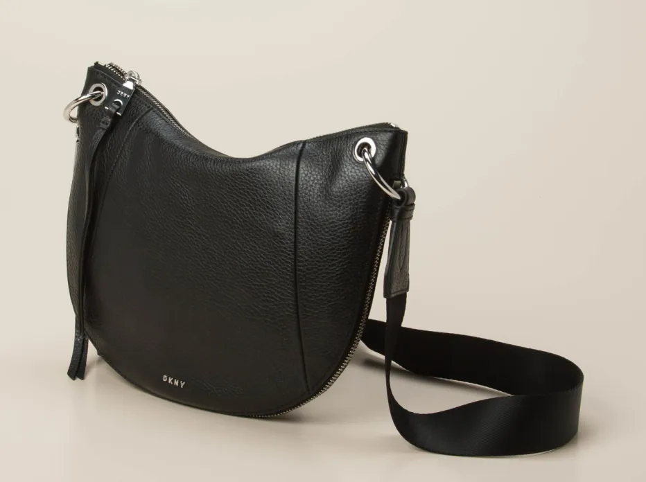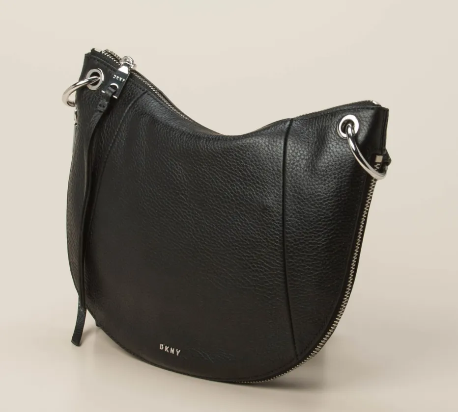 In einem eleganten und sportlichen Look zeigt sich diese Umhängetasche der Marke DKNY. Das schwarze Kalbleder ist auf der runden Silhouette hochwertig verarbeitet. Der silberfarbene Reißverschluss am Boden lässt beim Öffnen schwarzes Veloursleder hervorblitzen. Eine sportliche Note verleiht der Schulterriemen. Durch das Marken-Wording auf der Vorderseite ist diese Tasche unverkennbar. – Obermaterial: Kalbleder – Futter: Textil mit Logoprint – Farbe: schwarz – Größe: ca. 20 x 27 x 6 cm (H x B x T) – Schulterriemen: max. Länge ca. 118 cm, verstellbar – Verschluss: Reißverschluss – Innen: ein Reißverschlussfach, ein Steckfach