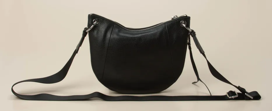 Diese Crossbody-Tasche aus genarbtem Kalbleder vereint minimalistische Ästhetik mit urbanem Luxus. Die markante Halbmondform harmoniert perfekt mit der silberfarbenen Hardware.