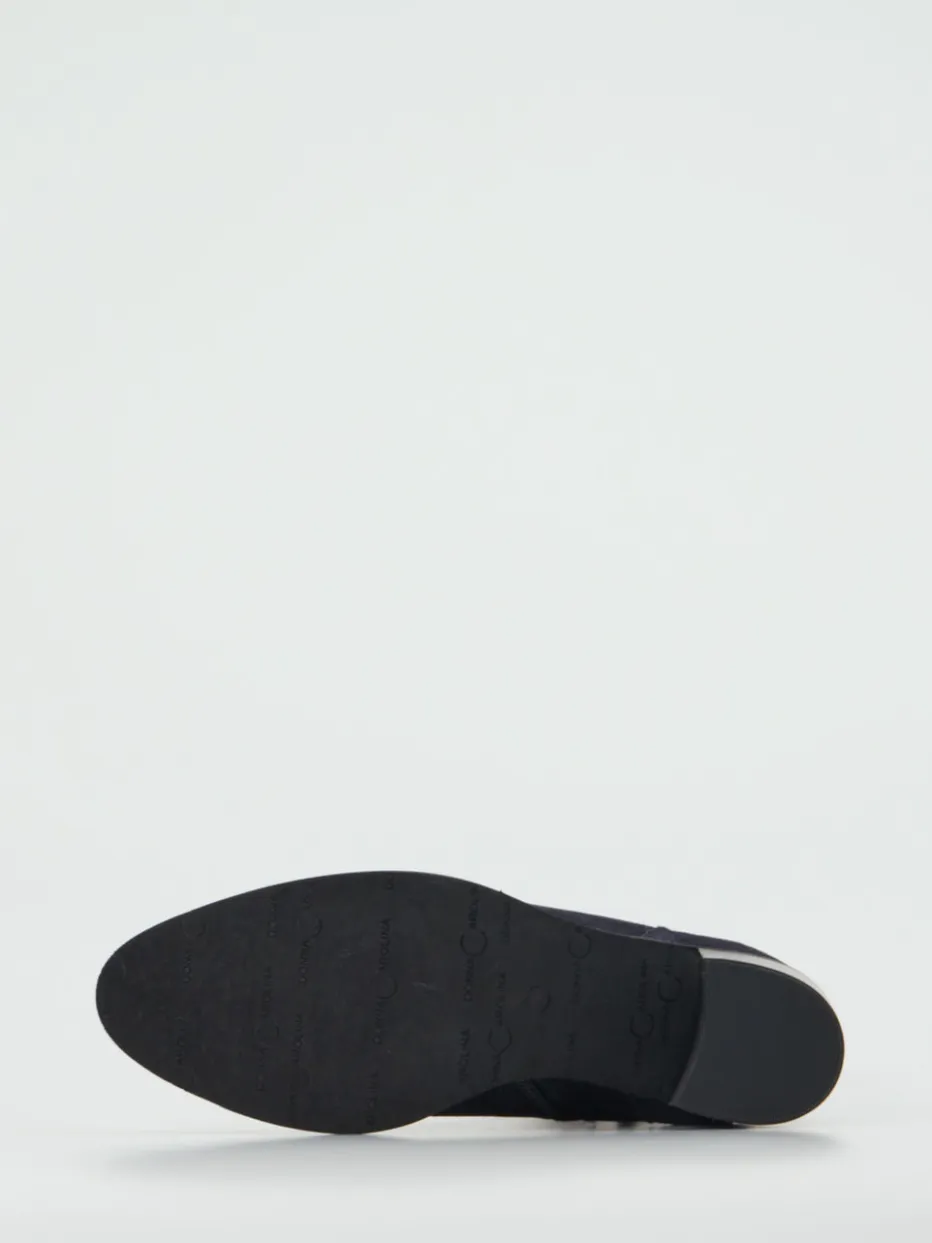 Stilvoll im Alltag und Büro.Die Marke Donna Carolina präsentiert eine elegante Damen-Stiefelette aus feinstem Veloursleder. Für Situationen, in denen ein gepflegter Look verlangt ist, überzeugt dieses Modell mit seinem samtig-matten Finish und der tiefdunkelblauen Farbgebung. Die klassische, leicht spitz zulaufende Form unterstreicht den zeitlosen Charakter, während ein Innenreißverschluss mit elastischem Einsatz das Anziehen erleichtert. Markante Details wie die schwarze Zugschlaufe mit Logoprint sorgen für dezenten Wiedererkennungswert. Die Gummisohle mit mittelhohem Blockabsatz sorgt für Komfort im Alltag. Der stilistische Einfluss urbaner Zurückhaltung trifft den Kern aktueller Trends wie „Quiet Luxury“. Ein souveräner Begleiter für moderne City-Looks in hochwertiger Ausführung.