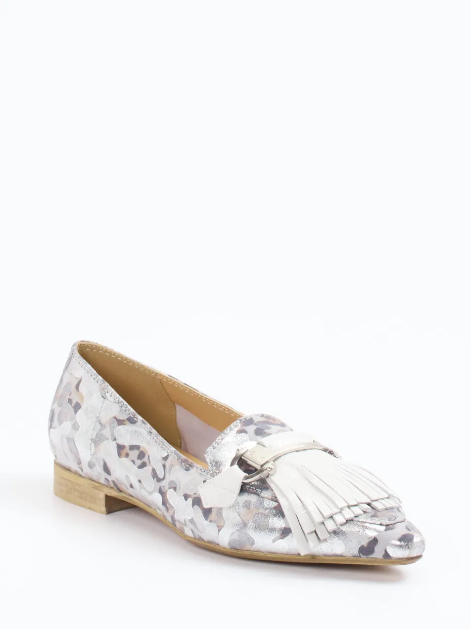 Der edle Loafer kombiniert schimmerndes Metallicleder mit floraler Animal-Struktur und klassischer Fransenlasche – stilvoll für Büro und Alltag.