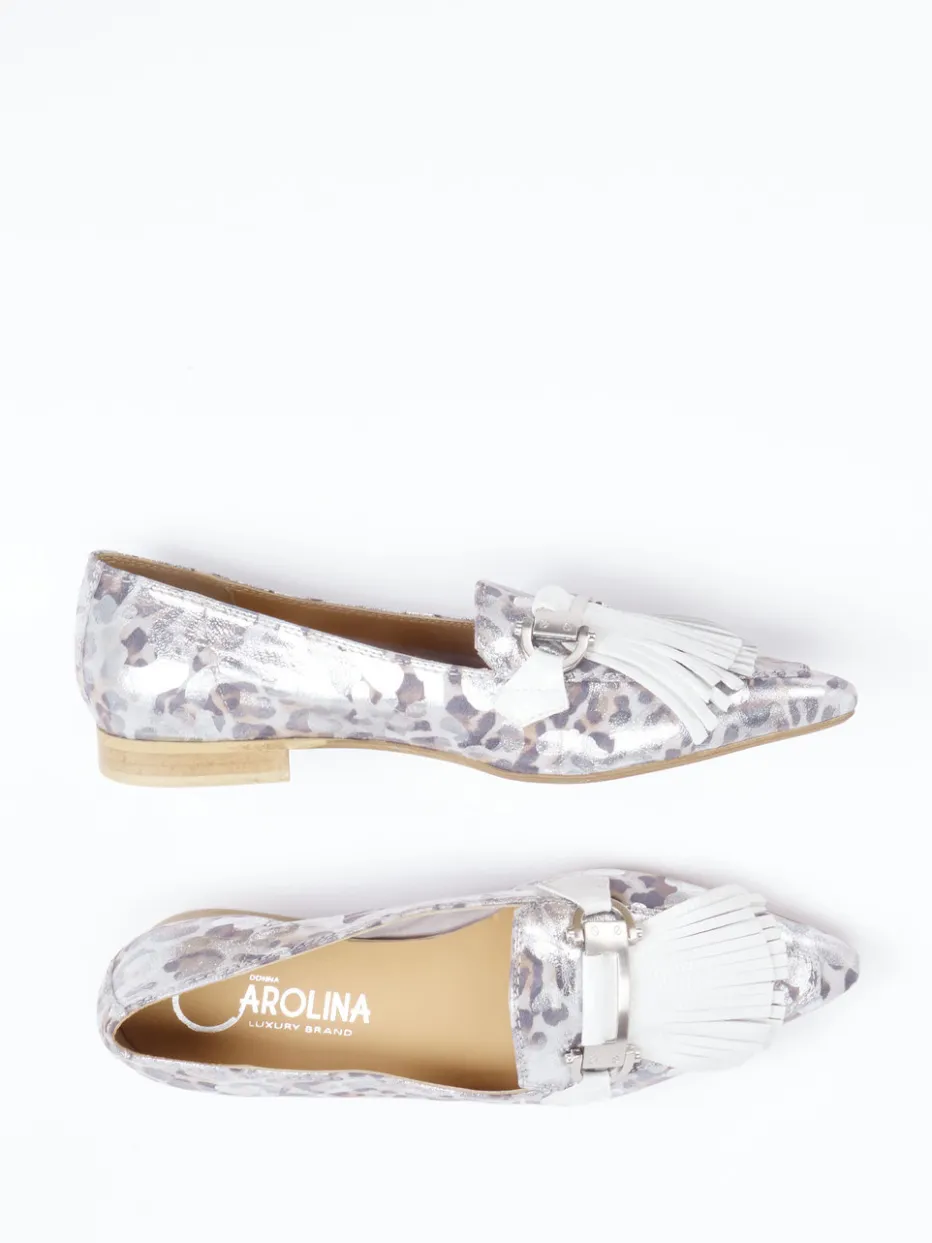 Maximaler Stil, minimaler Aufwand.Donna Carolina präsentiert einen Damen-Loafer mit exklusivem Metallic-Finish in silbernem Animal-Print. Ideal für den urbanen Lebensstil kombiniert dieser Loafer glänzendes Metallicleder mit einem präzise gearbeiteten floralen Leopardenmuster. Die spitz zulaufende Silhouette, die dekorative Fransenlasche und die silberfarbene Zierspange unterstreichen die hochwertige Verarbeitung. Weiches Futter aus nudefarbenem Kalbleder und ein gepolstertes Fußbett sorgen für Tragekomfort, während die holzfarbene Gummisohle modischen Bodenhaftung liefert. Frisches Design, das „Quiet Luxury“ und Vintage-Flair stilvoll vereint. Understatement mit Charakter – designed von Donna Carolina.