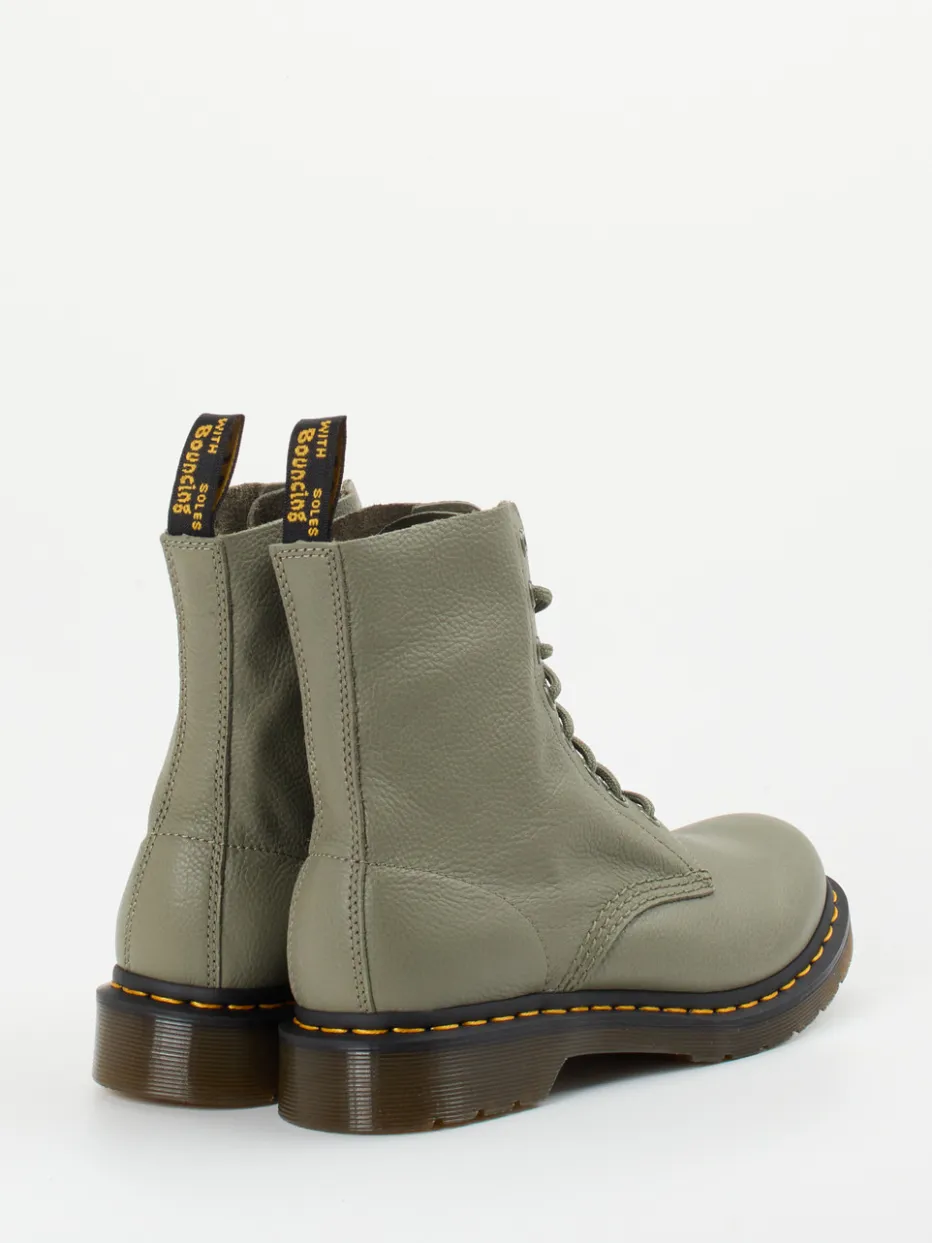 Die 1460 Pascal Boots aus genarbtem Virginia-Kalbleder vereinen ikonische Docs-DNA mit angesagter Gorpcore-Ästhetik in Salbeigrün.