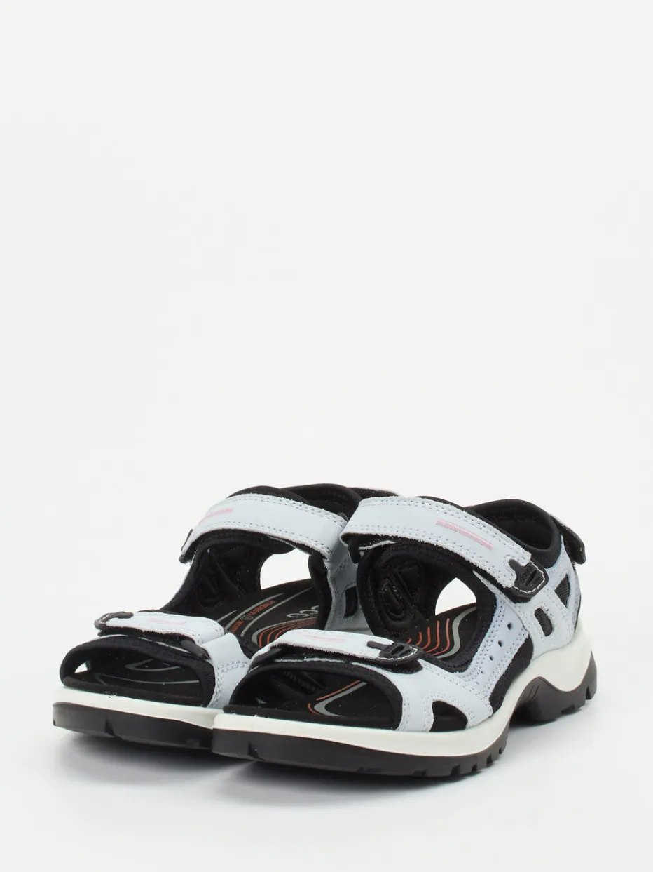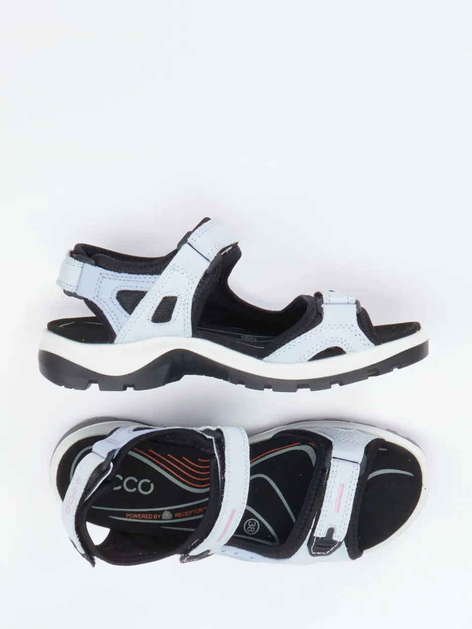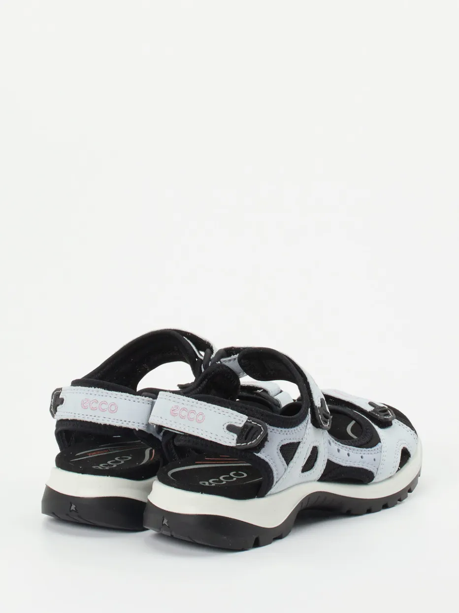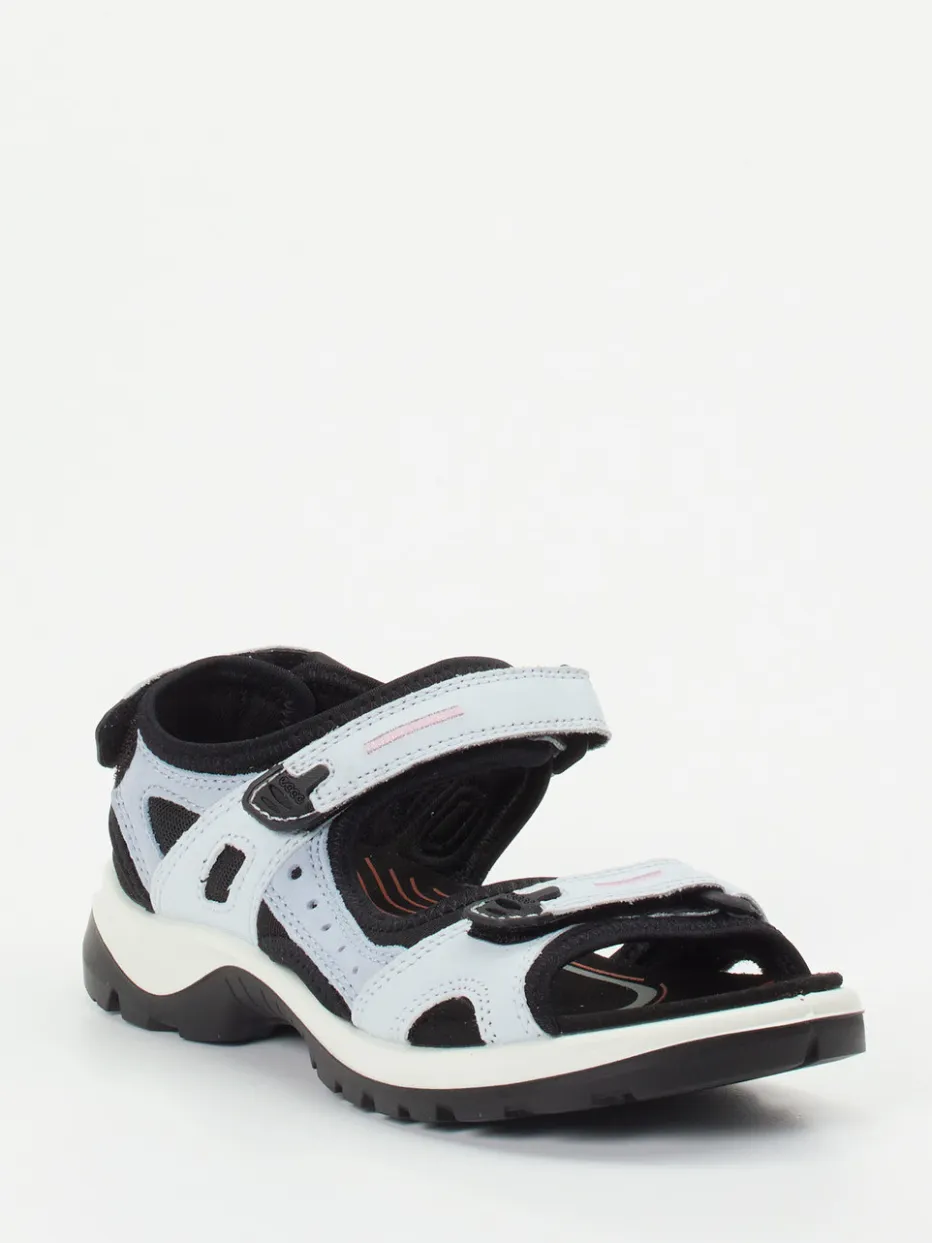 Komfort und Funktion für unterwegs.Ecco präsentiert eine Damen-Trekkingsandale, die sportive Lässigkeit mit durchdachter Funktion vereint. Ideal für Wanderungen oder aktive Sommertage überzeugt das Modell durch hellgrau-blaues Nubukleder, das samtig angeschliffen ist. Unterlegte Riemchen aus schwarzem Textil bieten angenehmen Tragekomfort, während Klettverschlüsse für eine individuelle Passform sorgen. Die offene, funktionale Silhouette mit ergonomischem Fußbett und rutschfester Gummisohle unterstreicht den Outdoor-Charakter. Dezente Kontrastnähte und ein Markenlogo runden das Erscheinungsbild ab. Inspiriert vom Gorpcore-Trend passt sie hervorragend zu Funktionsmode. Zuverlässige Performance trifft auf markentypische Alltagstauglichkeit.