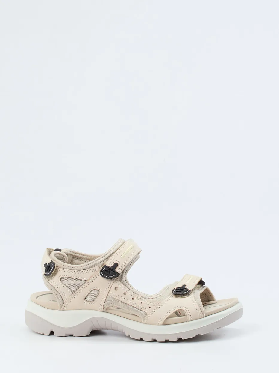 Im sportlichen Design begeistert diese strapazierfähige Trekking-Sandale von der Marke Ecco mit ihren komfortablen Eigenschaften. Das beigefarbene Nubukleder bekommt durch die grauen Nähte auf den Riemchen Struktur und ist mit angenehm softem, beigefarbenem Textil unterlegt. Die drei Klettverschlüsse ermöglichen eine ideale Passform und geben besonders guten Halt. Bequem zeigt sich die markant profilierte, flexible Gummisohle.