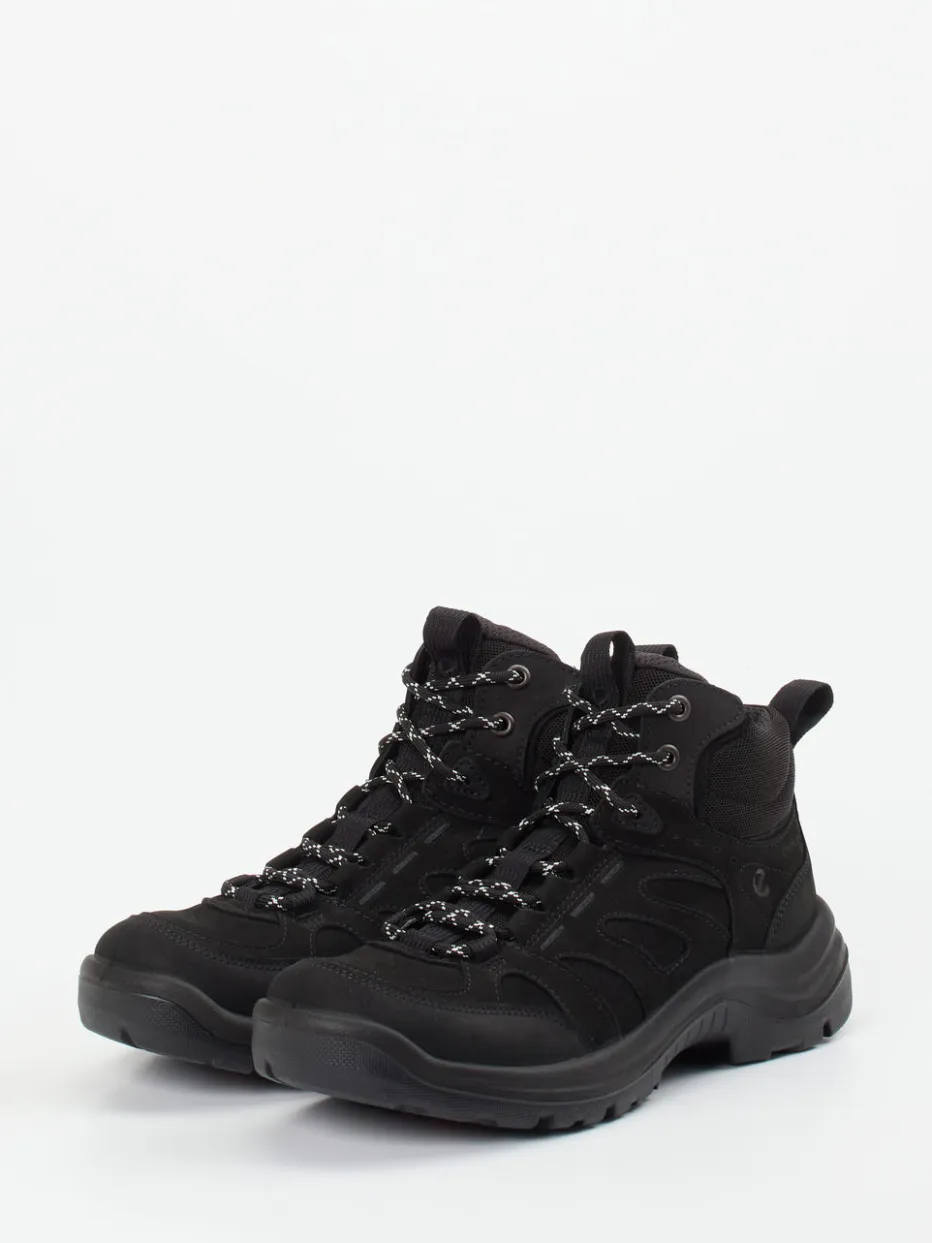 Robust für Stadt und Strecke.Die Marke Ecco interpretiert den Wanderschuh funktional und stilsicher. Ideal für wechselnde Einsätze zwischen Natur und Alltag bietet dieser schwarze Schnürstiefel aus Nubukleder optimalen Halt. Samtig angeschliffen und ergänzt durch atmungsaktive Mesh-Einsätze vermittelt das Obermaterial eine griffige Haptik. Das dezente Farbkonzept in Schwarz mit reflektierenden Details wird durch rote Akzente an der profilstarken Gummisohle ergänzt. Eine komfortable Polsterung im Schaftbereich und ein austauschbares Fußbett erhöhen die Alltagstauglichkeit. Die knöchelhohe Form passt zum Utility- oder Gorpcore-Look – etwa in Kombination mit Cargo-Pants oder Funktionsjacke. Maximale Funktion und Komfort im progressiven Outdoor-Design von Ecco.