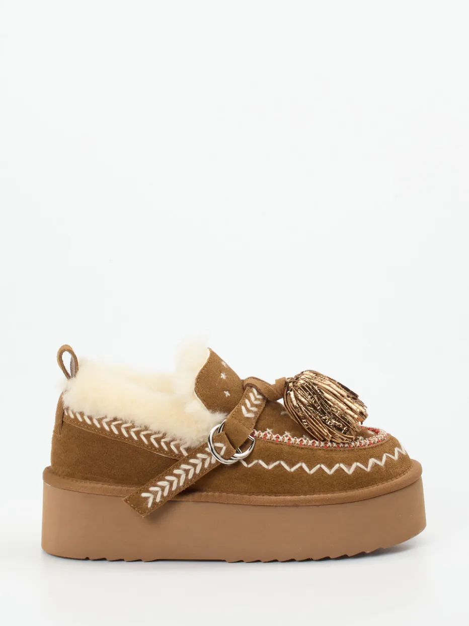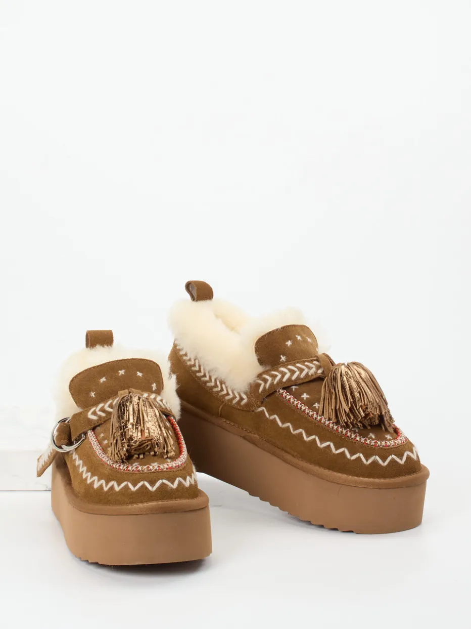 Ideal für kalte Spaziergänge oder entspannte Wintertage in der Stadt: Die kuschelige Lammfellfütterung sorgt für angenehme Wärme, während das matte Leder mit kunstvollen Stickereien und goldfarbenen Quasten stilvolle Boho-Akzente setzt. Mit charakteristisch geschlossener, runder Silhouette, dekorativem D-Ring und rutschfester Gummisohle fügt sich das Modell in herbstliche Trendthemen wie „Craftcore“ und „Textured Layers“ ein. Kombiniert zu Strickleggings oder Oversize-Pullovern entfaltet sich der Look besonders stimmig.
