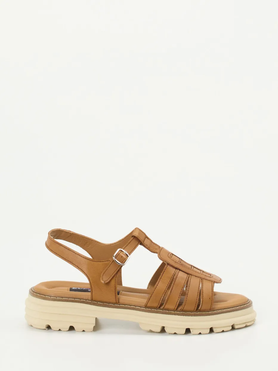 Diese cognacfarbene Fisherman-Sandale setzt auf weiches Kalbleder, markantes Design und hohen Sommerkomfort – perfekt für urbane Freizeit-Looks mit modischer Note.