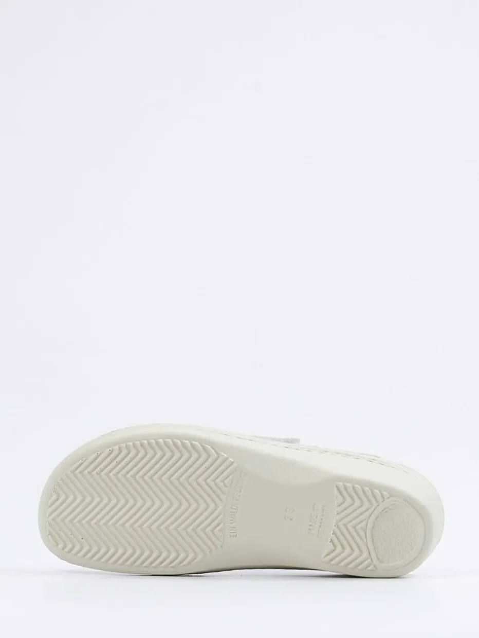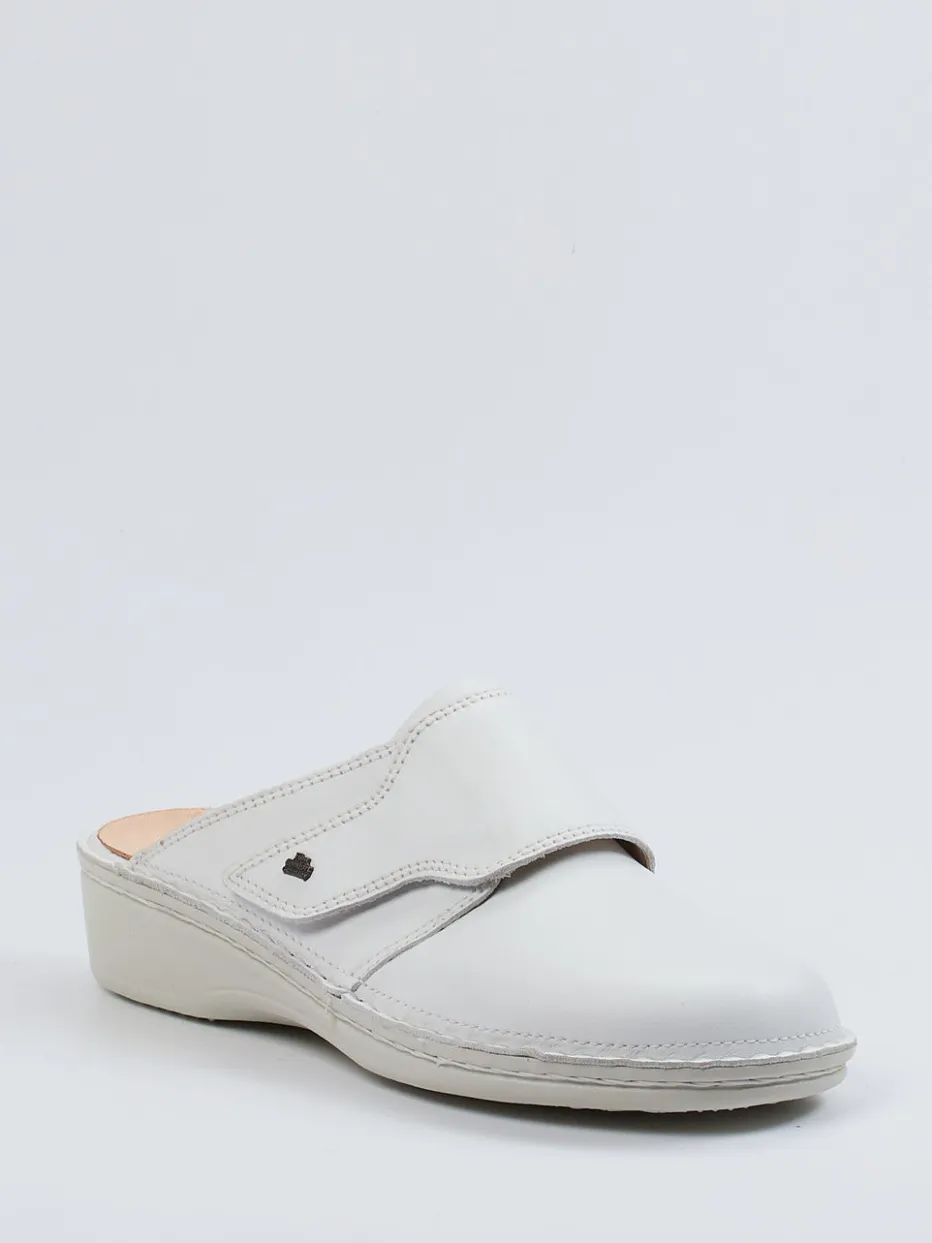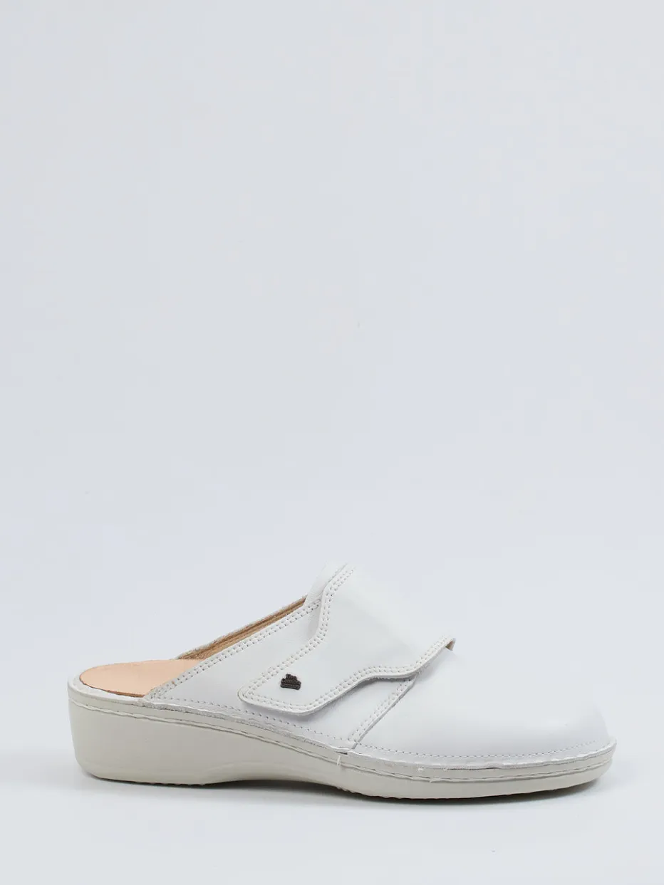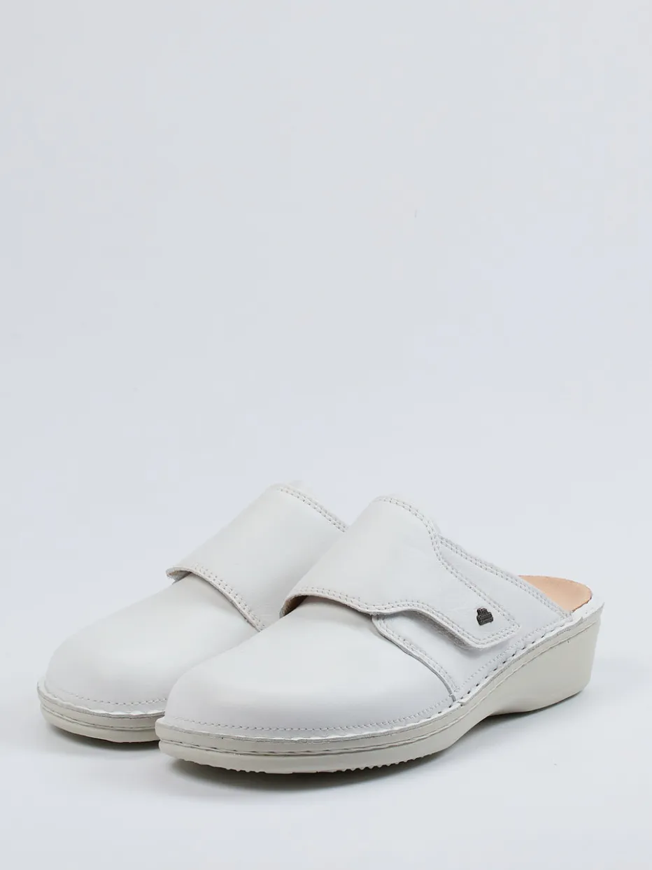 Wohltuender Komfort bei jedem Schritt.Finn Comfort präsentiert eine Damen-Komfort-Pantolette für Alltag und Zuhause. Das atmungsaktive Kalbleder in edlem Weiß überzeugt mit matter Oberfläche und dezenten Ton-in-Ton-Nähten. Ein großzügiger Klettverschluss ermöglicht einfache Weitenanpassung. Die ergonomisch geformte PU-Sohle mit leichtem Keil sorgt für Trittsicherheit, während das lederbezogene Korkfußbett herausnehmbar ist und individuellen Einlagen Platz bietet. Die geschlossene Frontpartie und der offene Fersenbereich ergänzen das minimalistische Design. Ideal zu legerer Sommerbekleidung kombinierbar. Höchster Laufkomfort dank handwerklicher Verarbeitung – typisch Finn Comfort.